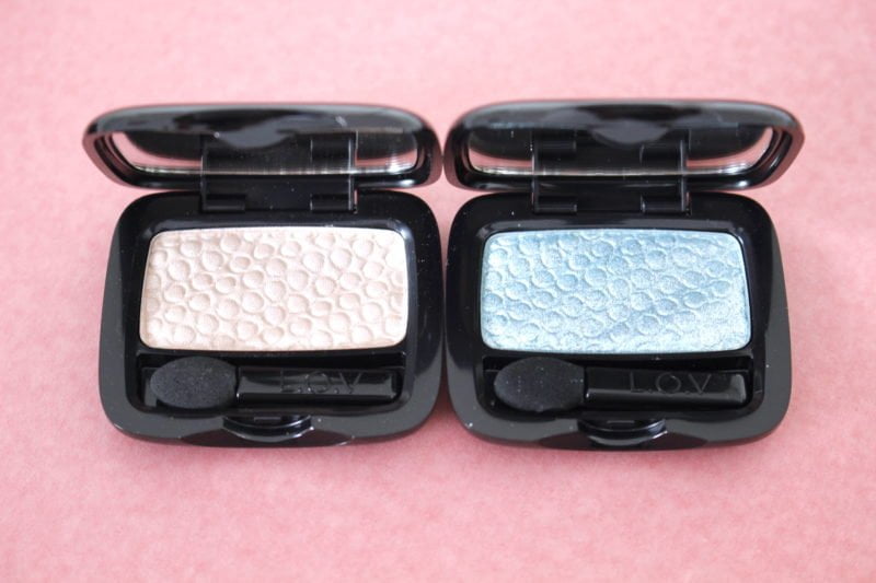 Unexpected heten de mono oogschaduws van L.O.V. Mooie glanzende tinten die in een mooi gewelfd design in hun verpakking zitten. De doosjes zijn klein en handzaam en hebben zelfs nog een spiegeltje. Je ziet hier de kleur 231 Ballet Dream aan de linker kant en 360 Lagoon Escape aan de rechterkant.