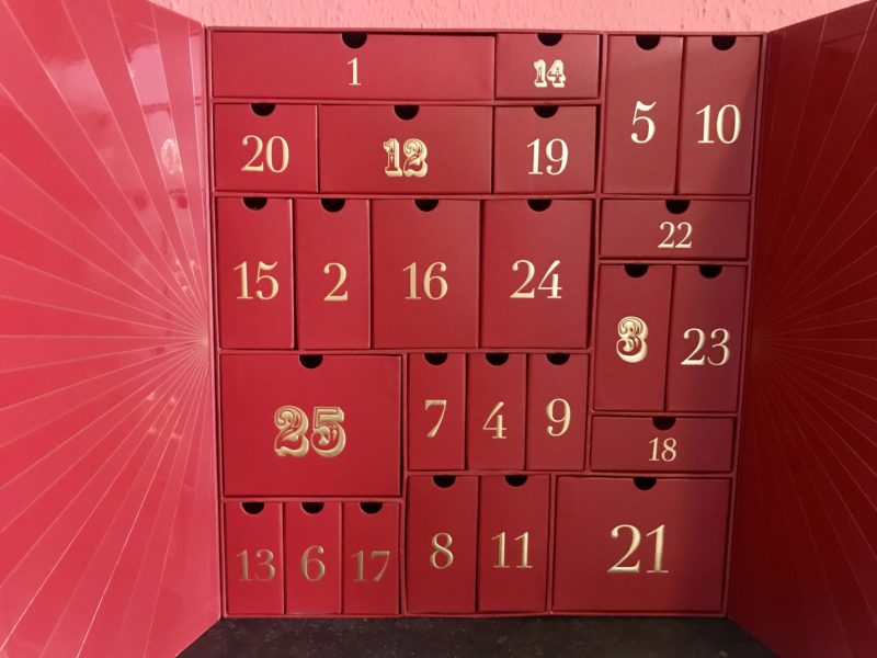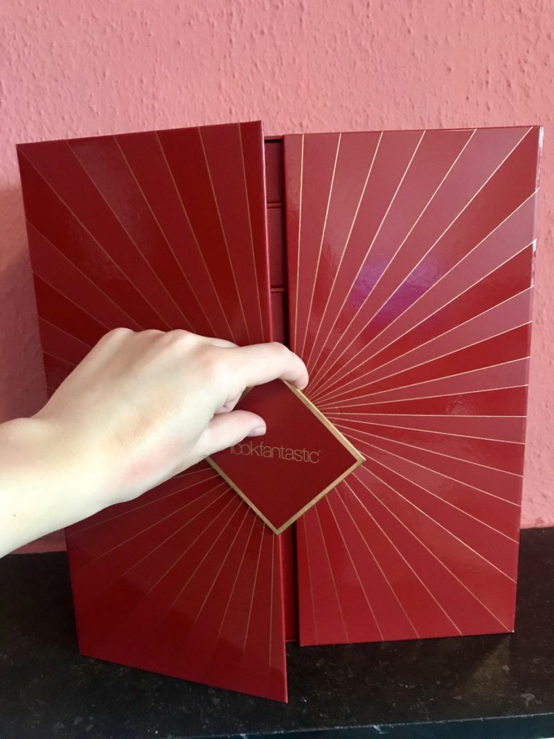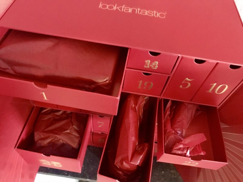Het is echt een hele mooie doos, een indrukwekkend cadeau! Je kunt 2 ‘deurtjes’ openen en dan zie je alle adventsvakjes. Waar het bij chocolade peuteren is om het deurtje te openen, zijn dit luxe lades die je open kunt trekken. In elk laatje zit een cadeautje van een merk dat ze verkopen op lookfantastic.nl. Elk cadeautje is verpakt in rood crêpe-papier. Je ziet dat sommige laatjes groter zijn dan de andere. Traditioneel gezien is nummer 25 vaak de grootste, zo ook hier. Ik moest mezelf echt in control houden om niet gelijk te gaan spieken wat er achter deurtjes nummer 25 zat, en dwong mezelf alle laatjes op volgorde te openen. But boy, 25 was een goede verrassing!