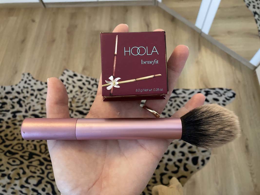 Dit is mijn favoriete duo om te bronzen. Ik gebruik Hoola van Benefit, een bronzer die niet te warm is en niet te koel van kleur. Hij is vrij intens gepigmenteerd, waardoor ik in de winter soms tijdelijk moet overstappen naar een iets lichtere kleur. Meestal houd ik het wel bij met zelfbruiner, waardoor ik het hele jaar door een beetje dezelfde gezichtskleur heb. Ik gebruik voor het aanbrengen de Blush Brush van Real Techniques. Dat klinkt verwarrend natuurlijk, omdat hij blush brush heet. Ik vind hem voor blush echter net iets te groot om gericht te kunnen aanbrengen en bronzer kwasten vind ik vaak iets te lomp. Deze heeft net het goede formaat voor mijn gezicht. De haren zijn synthetisch, die dikker zijn onderin en dunner bovenin. Hierdoor pakt hij subtiel het product op uit de verpakking, en kun je het goed opbouwen.