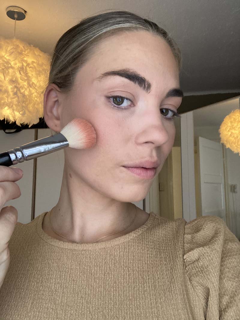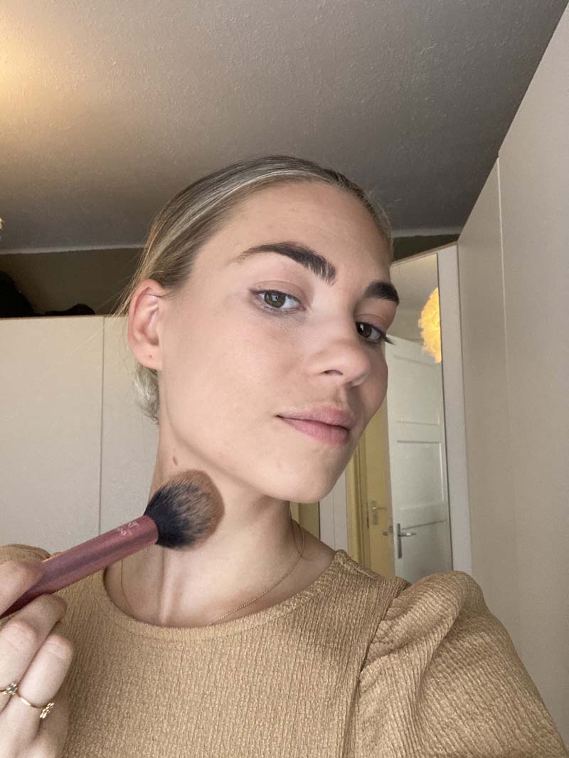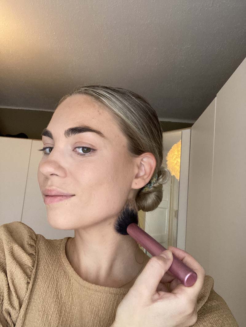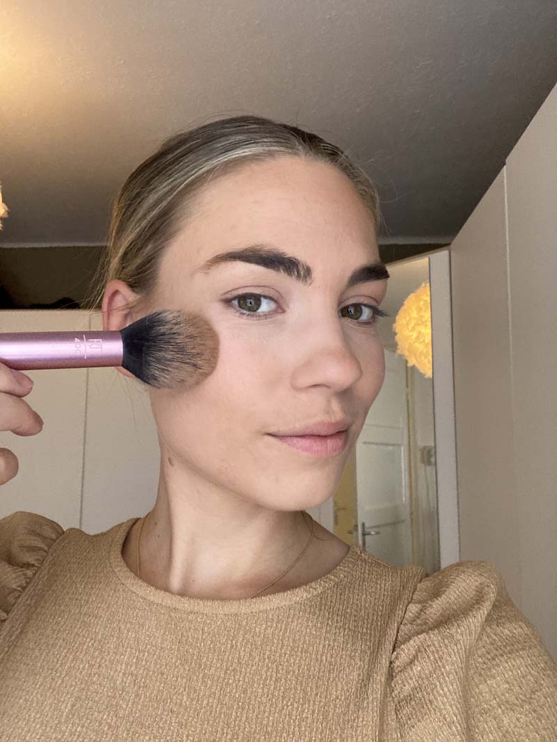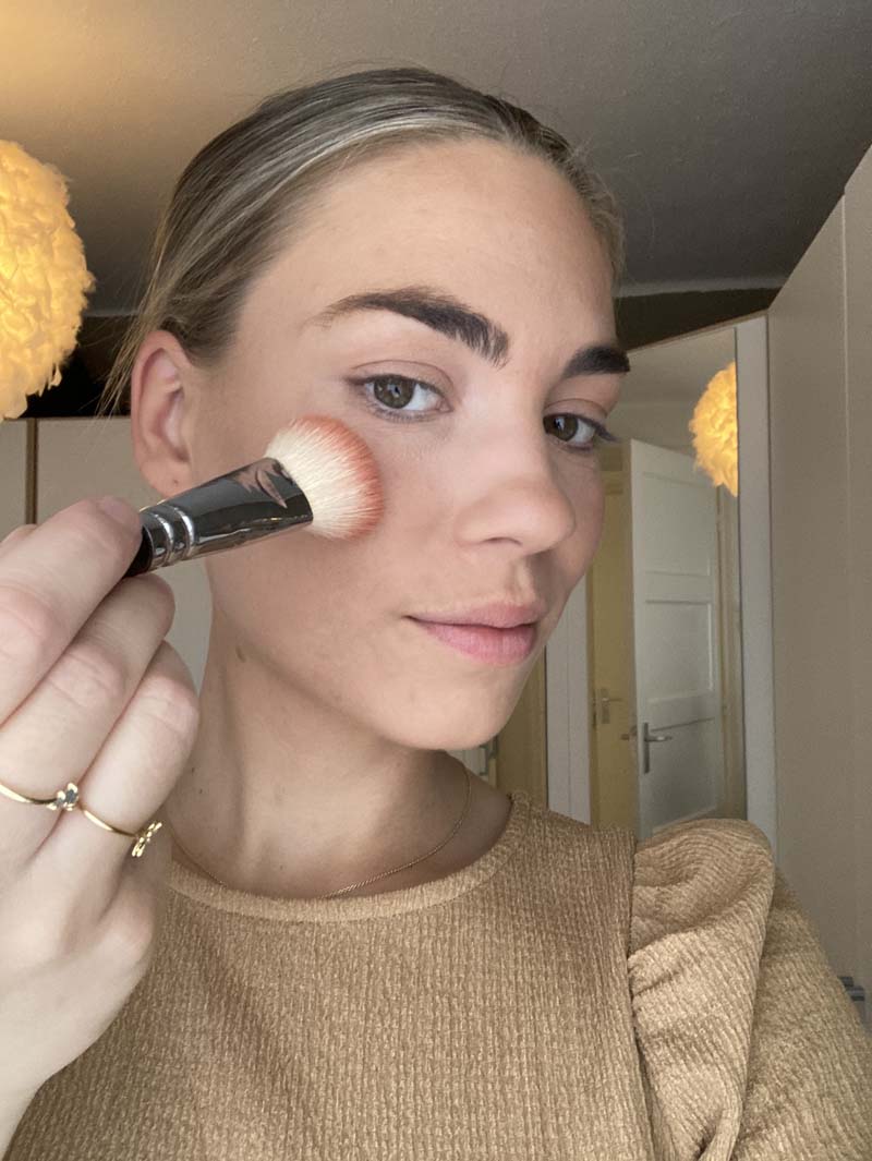 Met bronzer breng je de kleur terug in je gezicht, wat je net met foundation en concealer vlak hebt gemaakt. Ik begin met maken van een soort theatergordijn vorm op mijn voorhoofd waardoor het midden van mijn voorhoofd lichter blijft en de contouren van mijn gezicht gebronzed zijn. Je wil eigenlijk alle plekjes raken waar je van de zon ook als eerste gebruind wil worden. Ik gebruik mijn bronzer niet om mijn jukbenen strakker te maken bijvoorbeeld, dus niet als shaper, maar echt om een sunkissed look te krijgen.