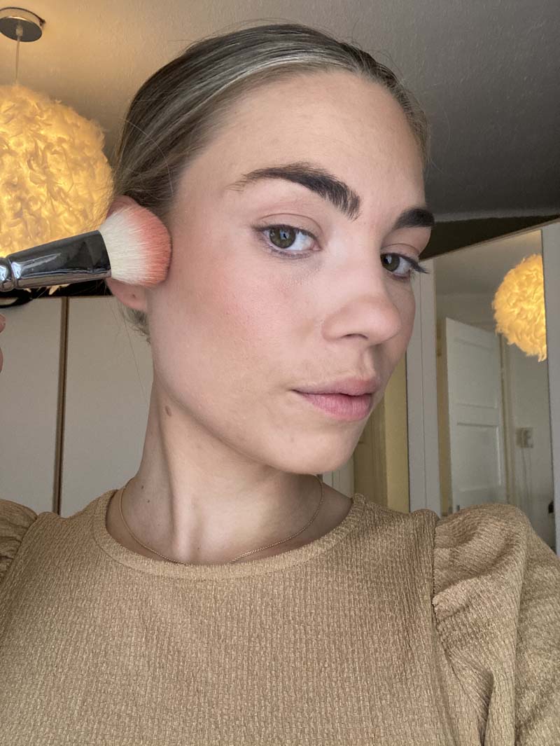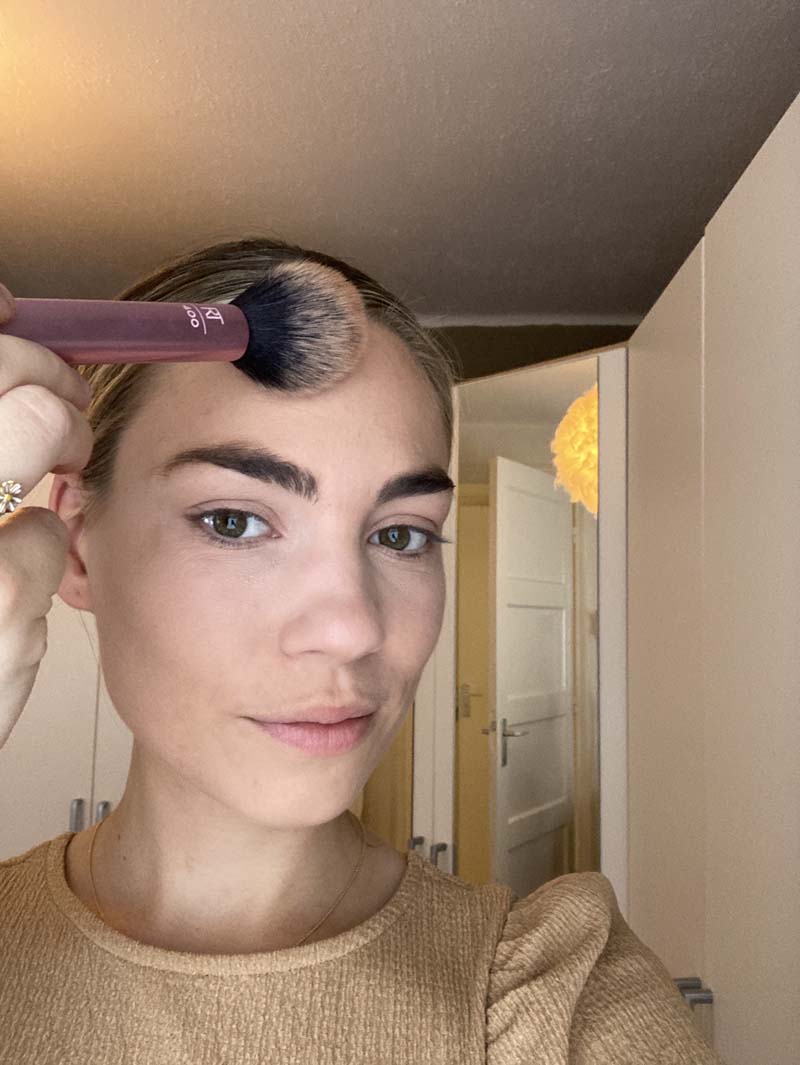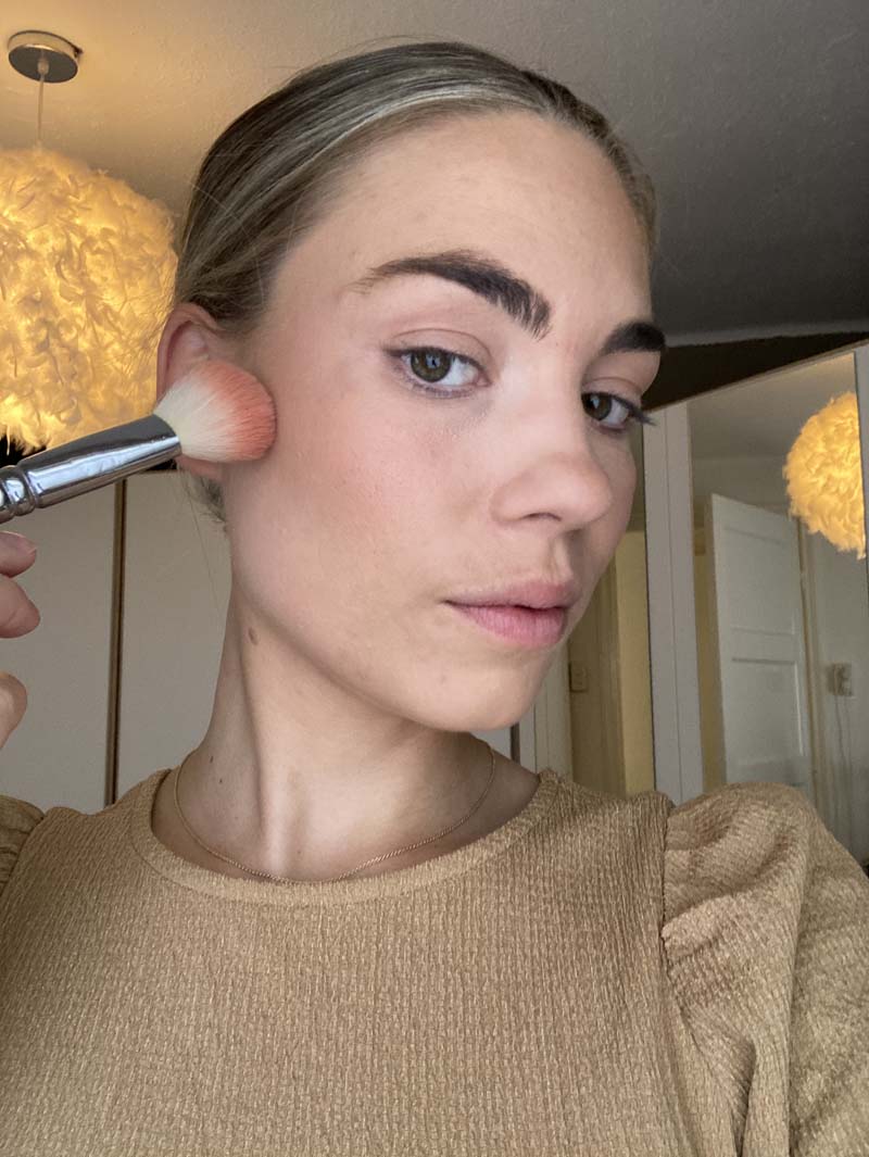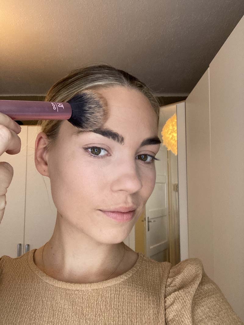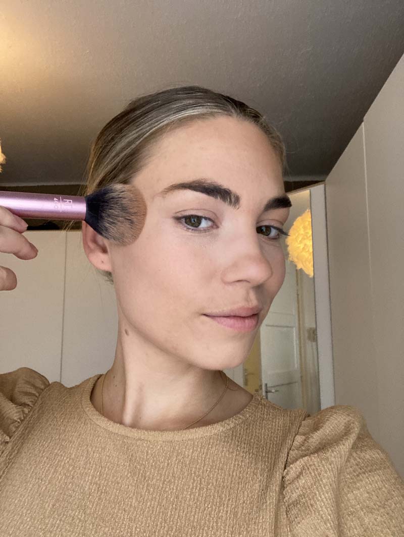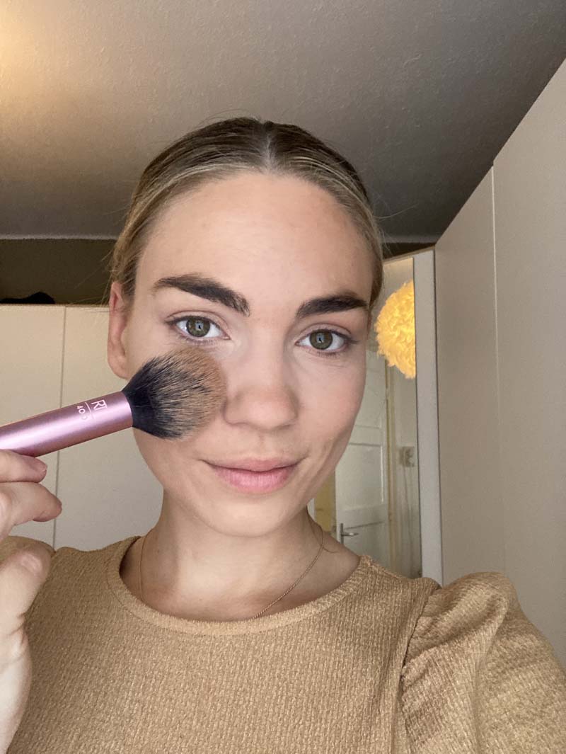 Met bronzer breng je de kleur terug in je gezicht, wat je net met foundation en concealer vlak hebt gemaakt. Ik begin met maken van een soort theatergordijn vorm op mijn voorhoofd waardoor het midden van mijn voorhoofd lichter blijft en de contouren van mijn gezicht gebronzed zijn. Je wil eigenlijk alle plekjes raken waar je van de zon ook als eerste gebruind wil worden. Ik gebruik mijn bronzer niet om mijn jukbenen strakker te maken bijvoorbeeld, dus niet als shaper, maar echt om een sunkissed look te krijgen.