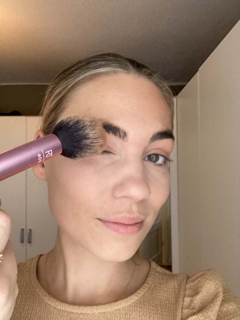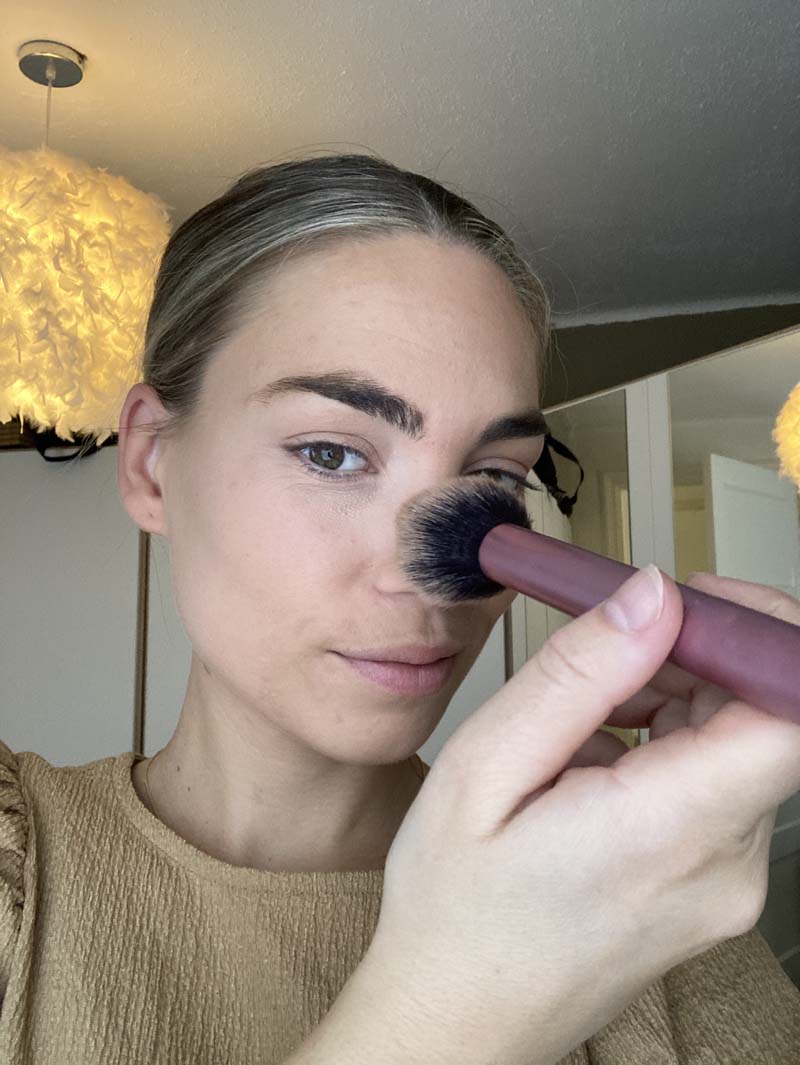 Ik haal de kwast ook over mijn oogleden, dit is vooral van belang als je geen oogschaduw draagt. Hierdoor geef je je oogleden een opfrisser en krijg je een algehele frissere blik. Ook ga ik met de kwast over de brug van mijn neus.