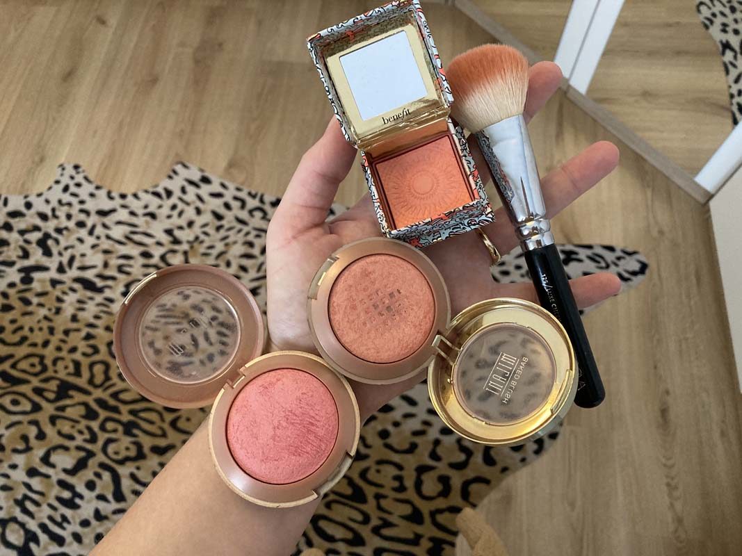 Dit zijn mijn lievelings blushes. Ik wissel af op basis van outfit. De ronde blushes zijn de baked blushes van Milani en hoewel dit een semi-budget merk is vind ik dat echt weinig kan tippen aan de kleurkeuzes van deze lijn. Ik gebruik de roze, nummer 01 Dolce Pink het liefst in combinatie met een koelere lipkleur en koele kleuren in mijn outfit. Heb ik warmere tinten aan zoals vandaag een bruin jurkje, dan kies ik voor 05 Luminoso of voor California van Benefit. Deze kleuren prachtig bij een warmere ooglook en/of lipstick.