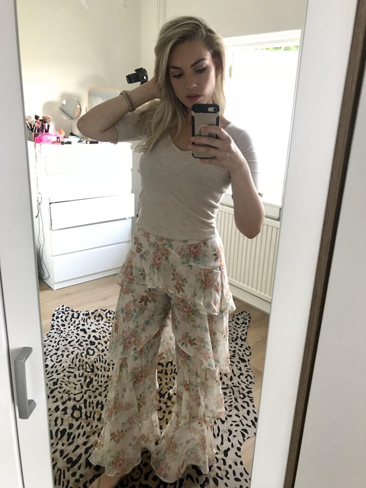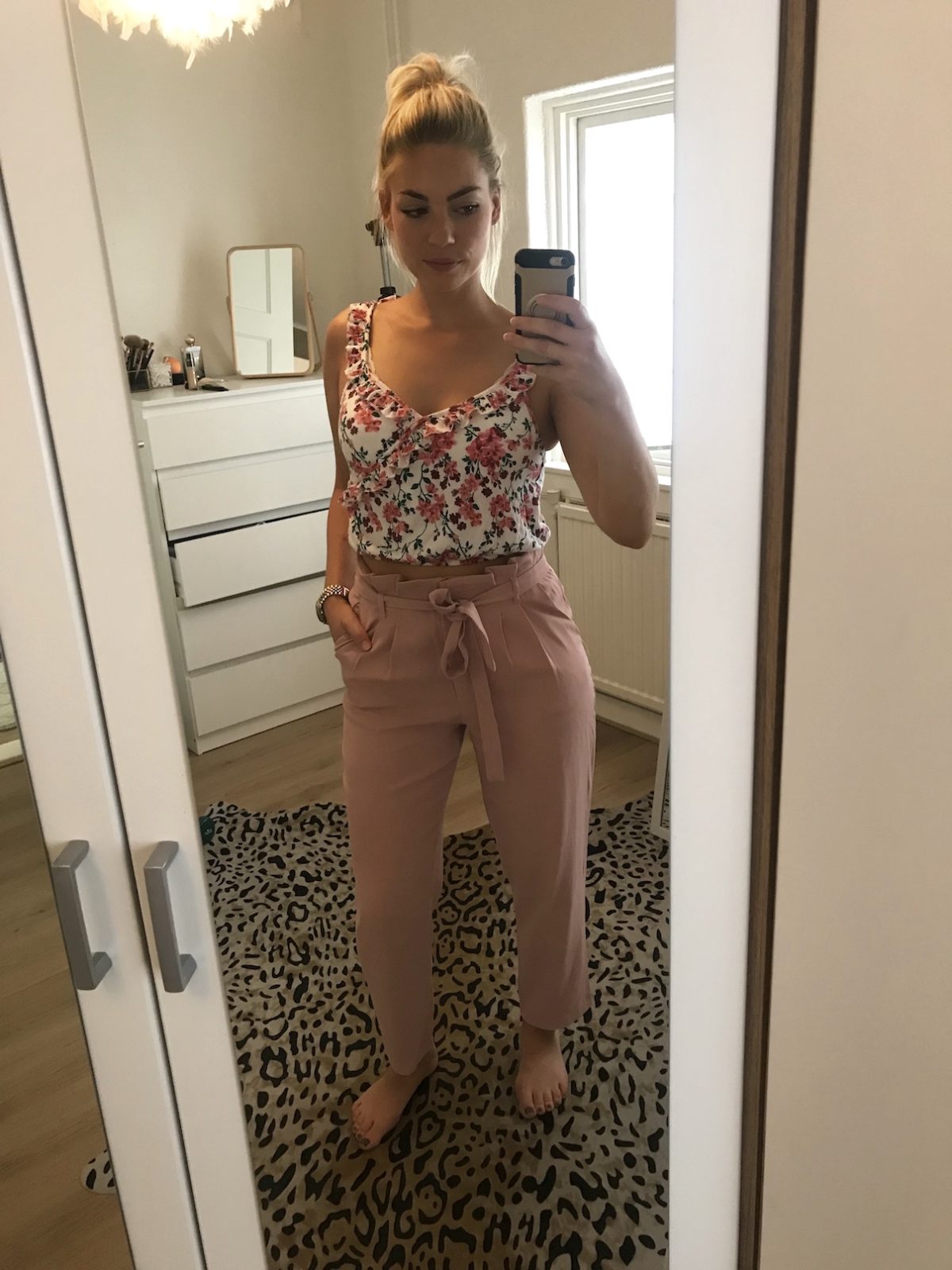 Bloemetjes trekken al snel mijn aandacht, en gecombineerd met een roze broek is het lekker girly. Reepje blote buik maakt het voor mij net iets spannender.