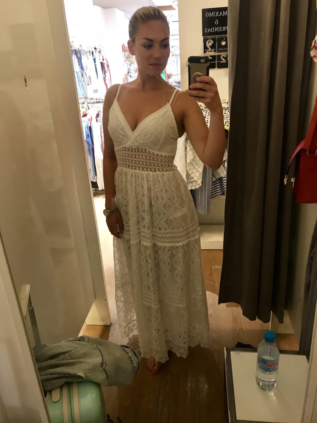 In Valencia zag ik deze dromerige jurk (dit was in de paskamer) en was er gelijk gek op. Mijn borsten en taille kwamen er mooi in uit en de lengte was precies goed. Ik heb hem nog maar 1 keer aangehad, want ik voel me er wel een beetje een bruidje in. Het moet wel een beetje bohemien gestyled worden met losse krullen etc.