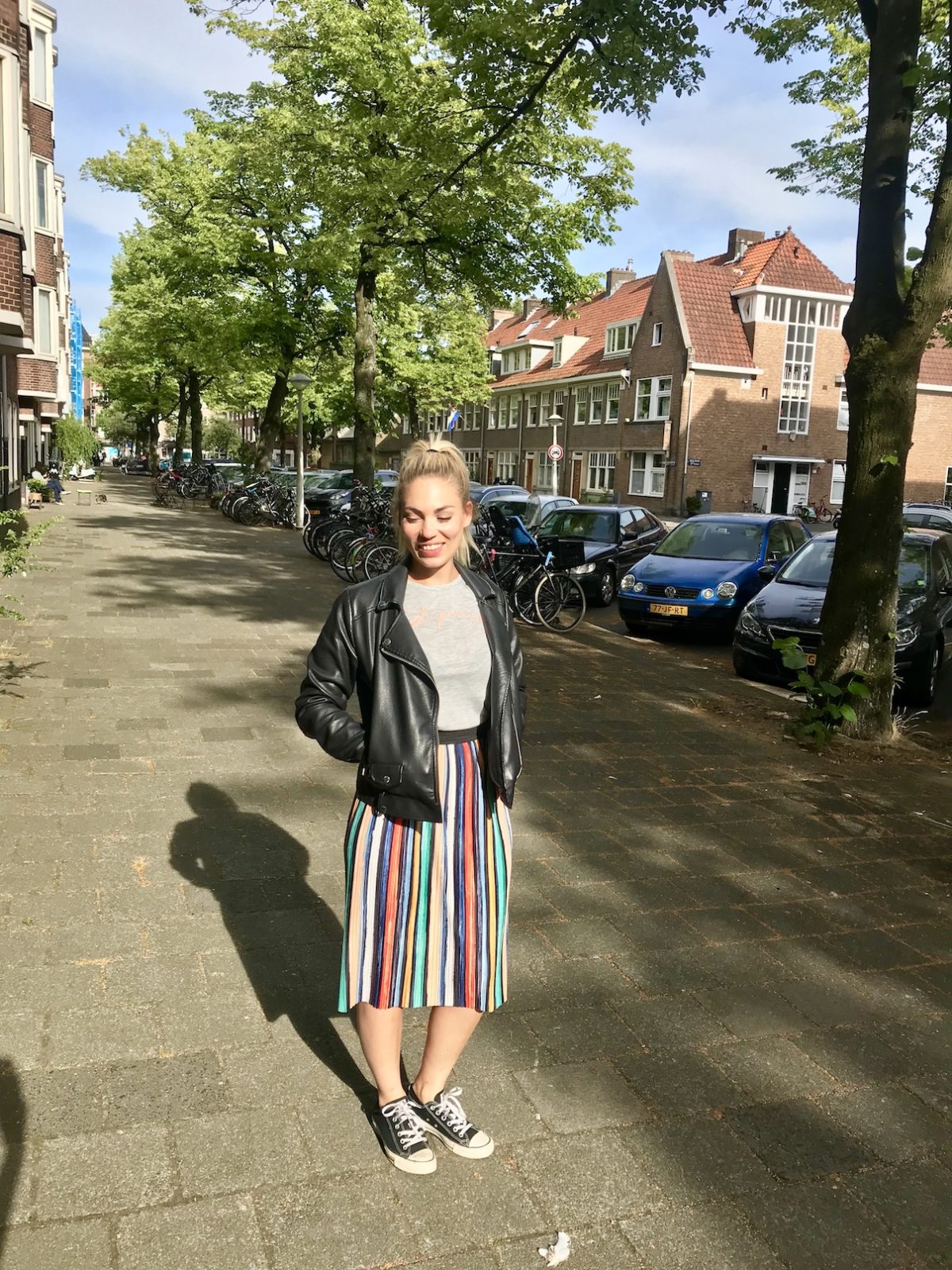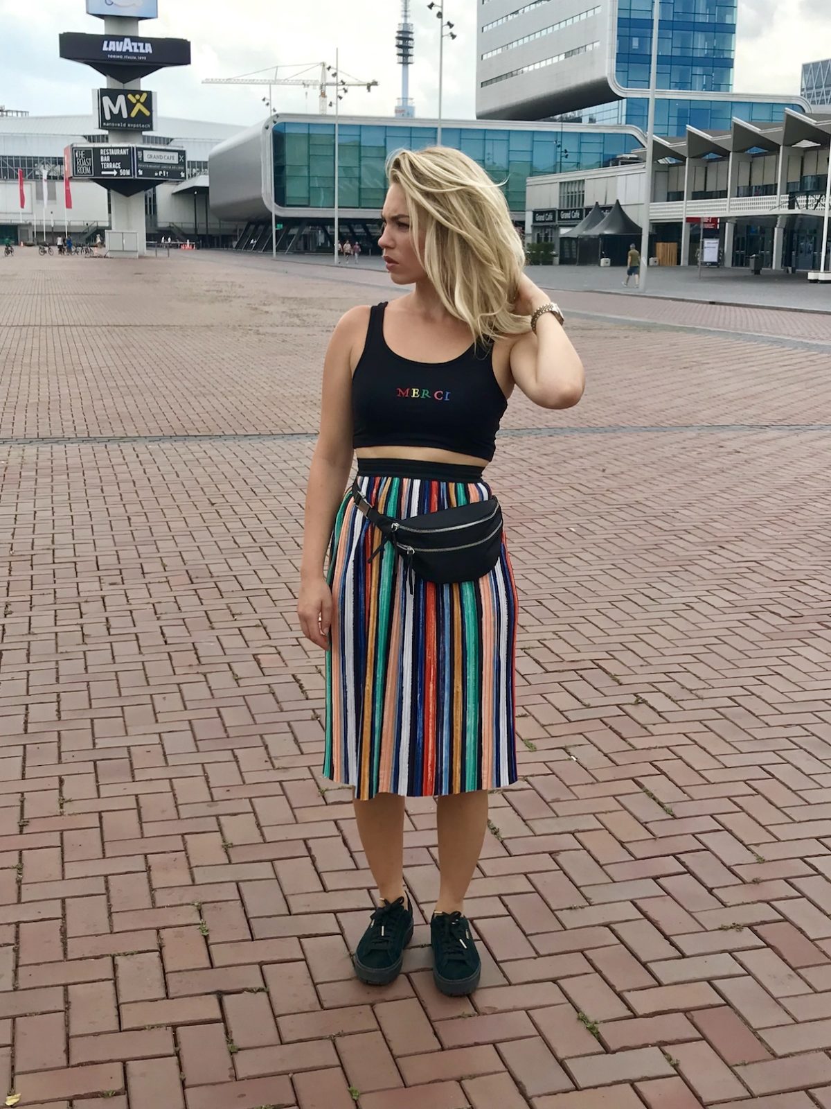 Gaypride 2018 outfit! Ik wilde iets kleurrijks, maar ook iets wat wel lekker zat. Een jumpsuit vind ik bij dat soort dagen lastiger omdat je dan de hele handel uit moet doen, deze rok wip je zo omhoog. Daarom werd het deze kleurige plissé rok. Ook nog leuk in het najaar met Dr. Martens en een trui.