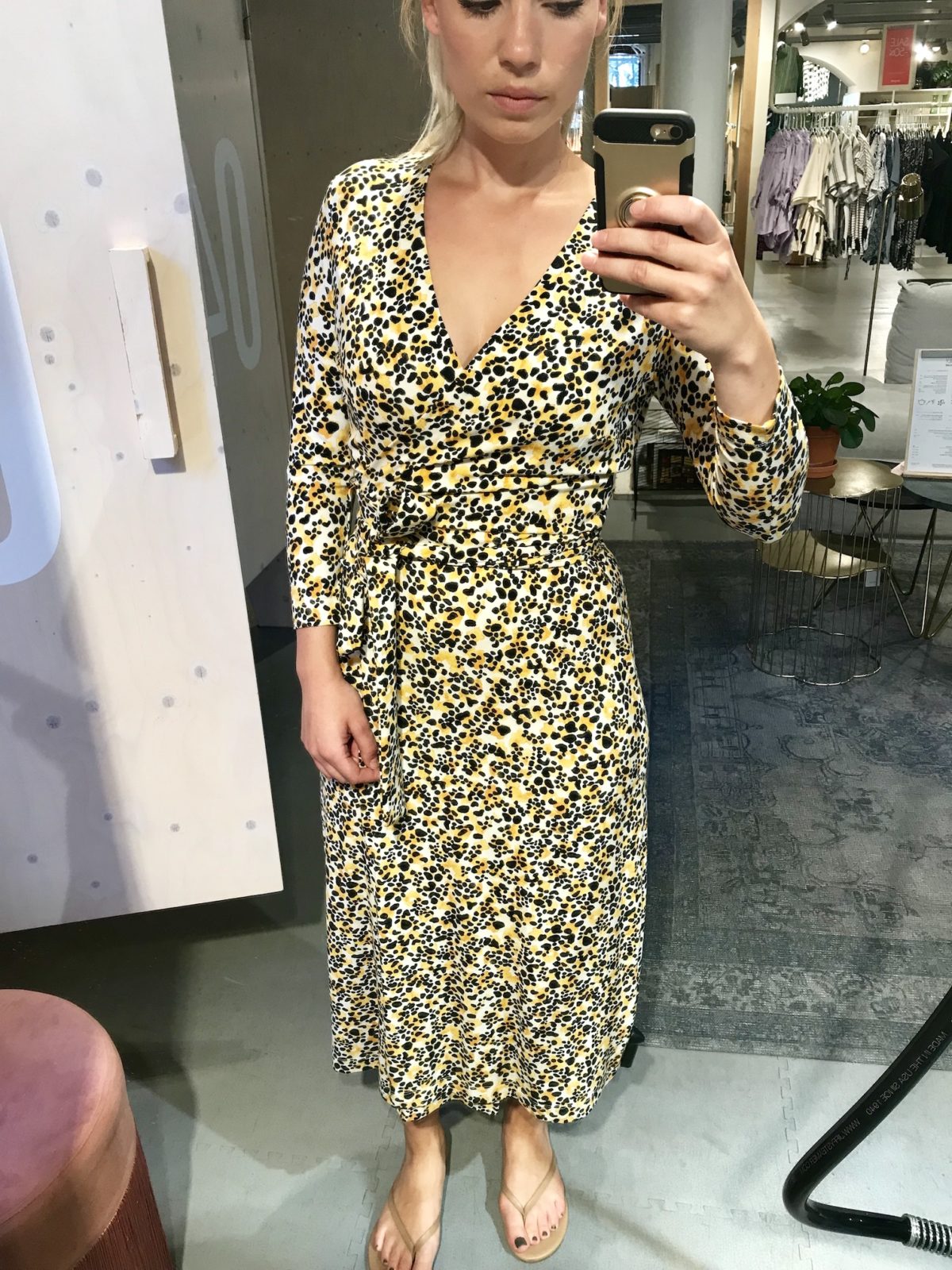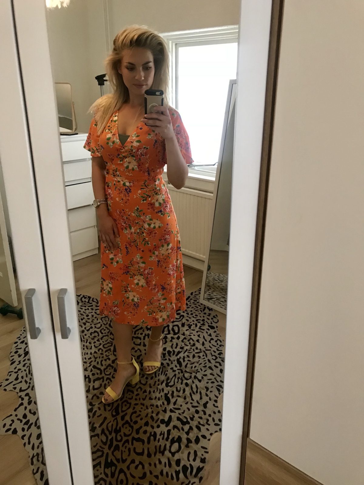 Deze jurk vind ik zo tof! De kleuren, de print. Ik wordt er echt vrolijk van. Bovendien zitten dit soort jurken mij mooi, en accentueert het de goede dingen van mijn figuur. Ik heb er wel een hemdje onder, want de stof is wat harder en dan staat je boezem zo ineens wagenwijd open. Ik pak dan het liefst een korte crop top, want dan rolt het niet omhoog in je middel. Deze gele schoentjes had ik in de hand en ik twijfelde. Wanneer draag ik ze? Ik heb ze inmiddels al heel veel aangehad want ze lopen super!
