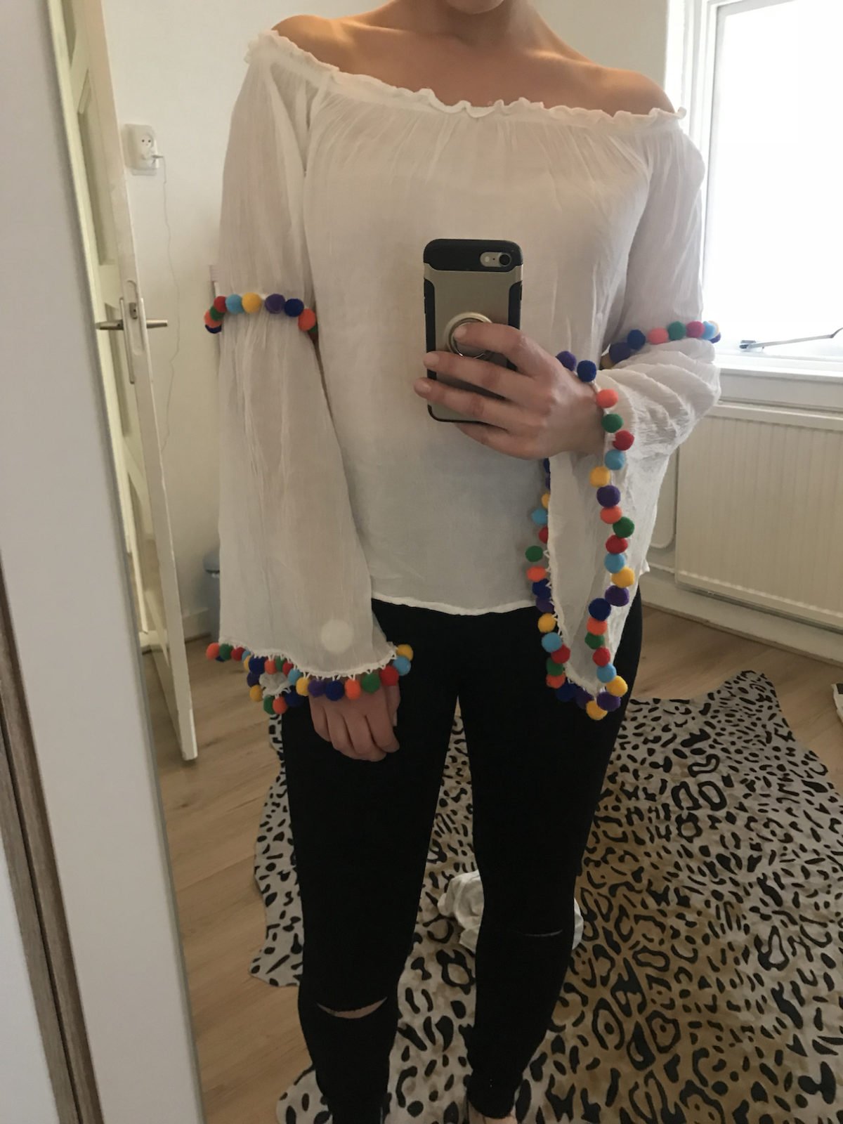Gooi ergens een pompom aan en ik kijk om. Door de wijde mouwen niet geschikt om sushi te eten, zeg ik uit ervaring. Off shoulder moet ik ook wel echt zin in aan hebben, het is toch vaak een trekwerkje, en strapless bh’s ugh… Don’t get me started on that. Toch is hij leuk.