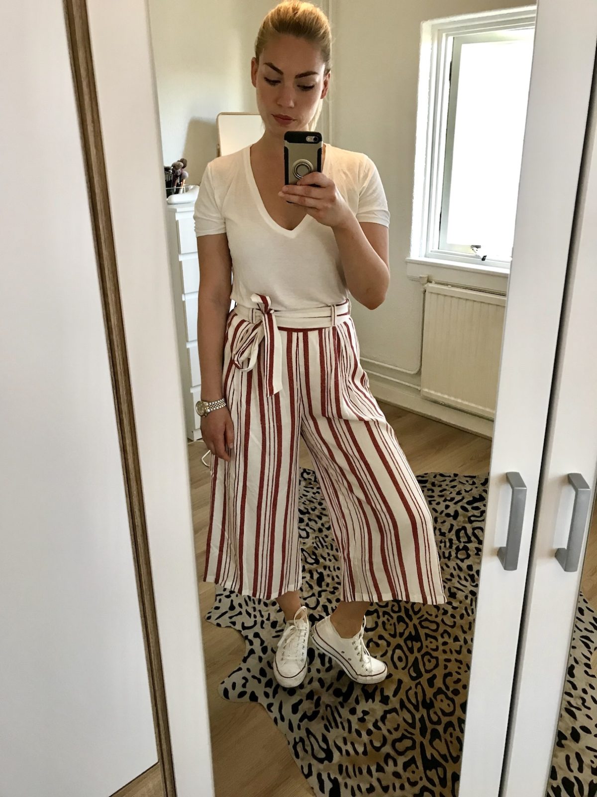 Gevaarlijke broek. Het zaagt je kuit namelijk korter af waardoor je breder en korter kunt lijken, toch vind ik niet erg genoeg om het niet te dragen. Doordat hij high waist is, krijgen je benen daar weer iets meer lengte mee. Ook zijn dit soort broeken super luchtig, waardoor je met warme dagen niet naakt hoeft als dat niet kan of als je dat niet wilt. V-hals t-shirts heb ik altijd in de kast. Maken het geheel simpel, maar vrouwelijk.