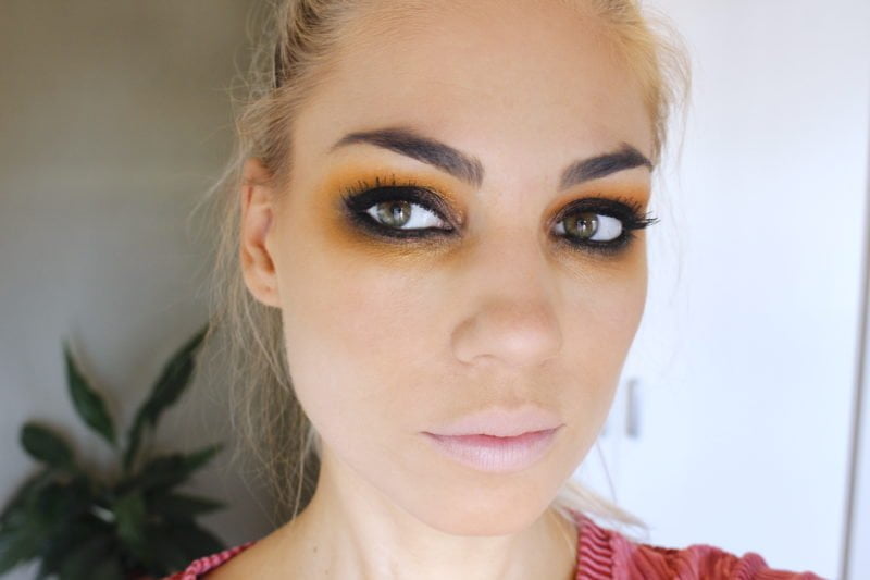 Dan pak ik het Sunset palette van Sleek erbij. Ik gebruik de fel oranje kleur om een grote kring/cirkel/c-vorm om mijn oog te maken. Dit doe ik met een grote blendingkwast. Je ziet dat er behoorlijk wat ruimte zit tussen de kleur oranje en mijn wimperrand.