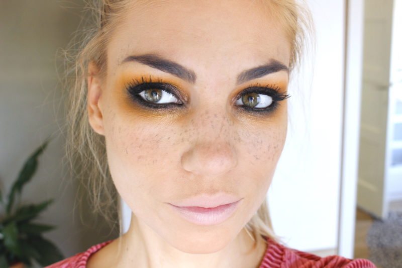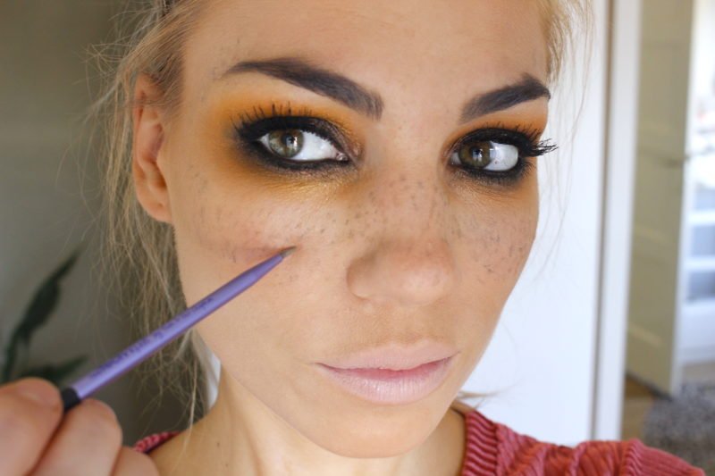 Dan mijn favoriete onderdeel, iets waar ik al tijden een excuus voor zoek. Sproeten tekenen! Ik gebruik wat dipbrow in een taupe-achtige kleur met een siliconen eyelinerkwastje. Daarmee zet ik gewoon stipjes. De ene wat groter dan de ander, niet te overdacht qua plaatsing en de een wat sterker qua kleur dan de ander. Hoewel het niet een heel natuurlijk effect geeft, daar heb ik denk ik nog wat oefening voor nodig, kan het voor zo’n Halloweenlook prima. Vind ik haha.
