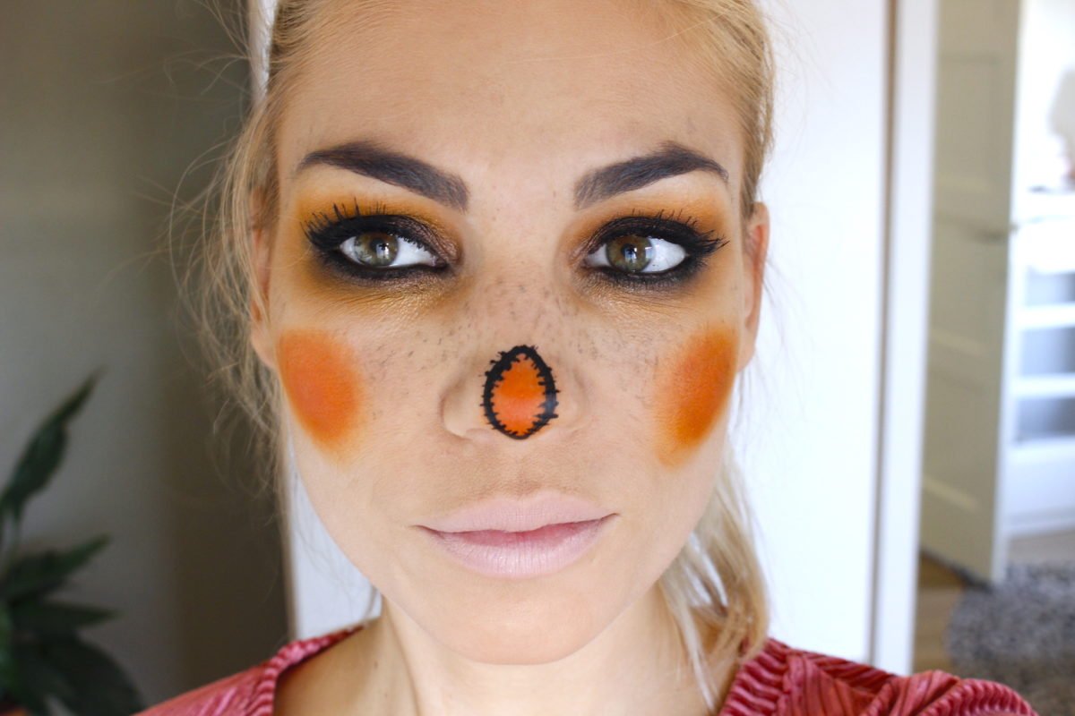 Met de oranje oogschaduw en een grote blendingkwast maak ik het poederiger, ronder en zachter aan de randen. Ook mijn neus moet er aan geloven, een oranje druppelvorm. Ook deze breng ik eerst aan met de lipstick, en daarna met de oogschaduw. Hierdoor krijg je een mooie dekkende ondergrond en een poederachtige finish, een resultaat wat goed blijft zitten.