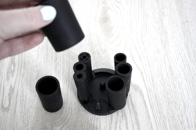 Ik ging aan de slag met behoorlijk wat kwasten, deze waren door de loop van de week heen allemaal vies geworden. Je zoekt een rubberen houder die bij de kwast past. Elke kwast past ergens in. De enige uitzondering was een wenkbrauwkwastje met een spoolie aan het uiteinde. Uiteindelijk kon ik die spoolie er ook wel indrukken maar dat is niet ideaal. Je hoeft dus niet bang te zijn dat een kwast te dik of te dun is.