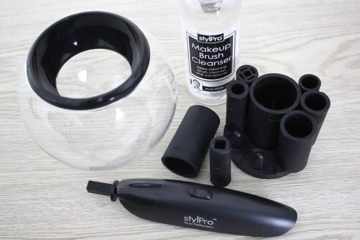 Als je de StylPro bestelt, krijg je een soort klein vissenkommetje, een machientje waar je je kwasten op moet zetten, verschillende rubberen houders om je kwasten passend te maken, en een houder om de houders dan weer op te bewaren. De cleanser zit er niet automatisch bij. Deze kun je los kopen voor €14,95.