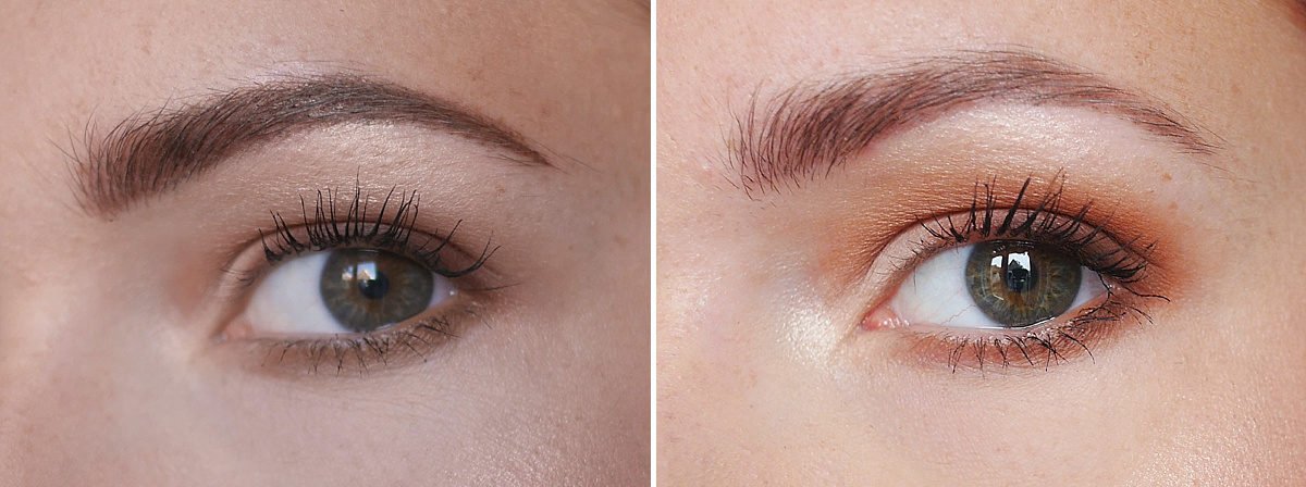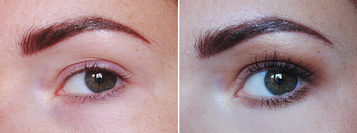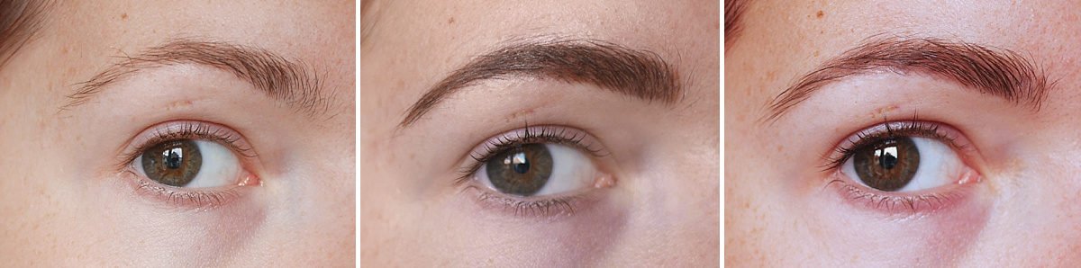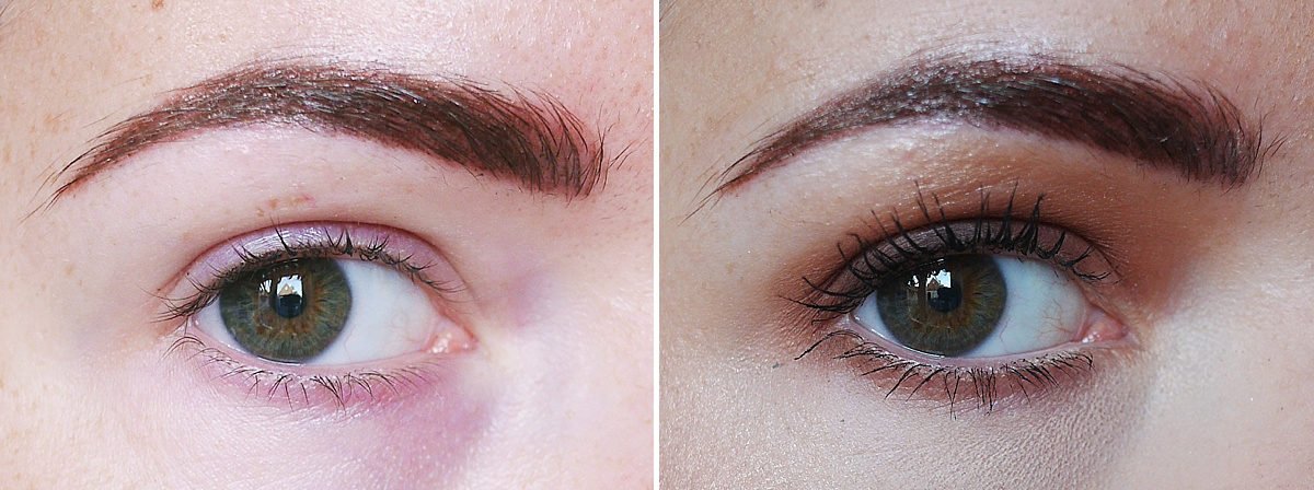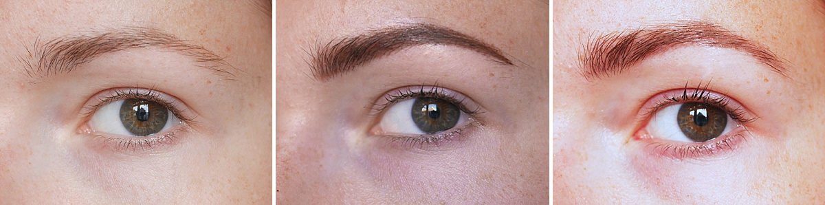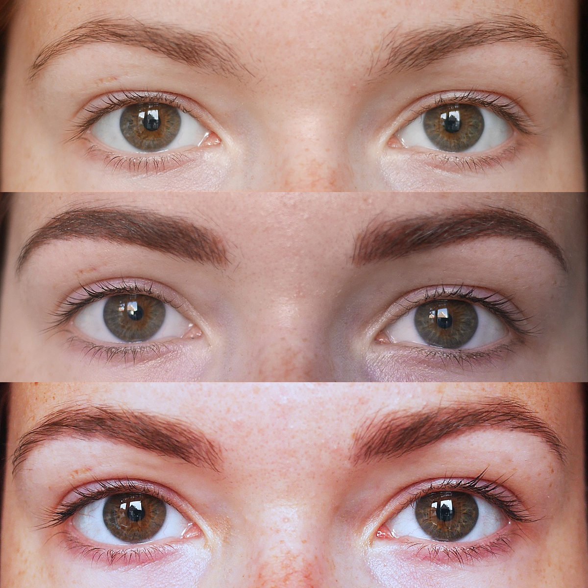 Eerst laat ik je de voor en na foto’s zien zonder make-up. Je ziet eerst op elke collage een voor foto, daarna een foto vlak na de eerste PMU-behandeling en de laatste foto is het resultaat na zes weken. Je ziet goed dat de kleur veel lichter is geworden en dat er wat ‘gaatjes’ gevallen zijn in mijn wenkbrauwen. Dat zijn we dus gaan bijwerken!