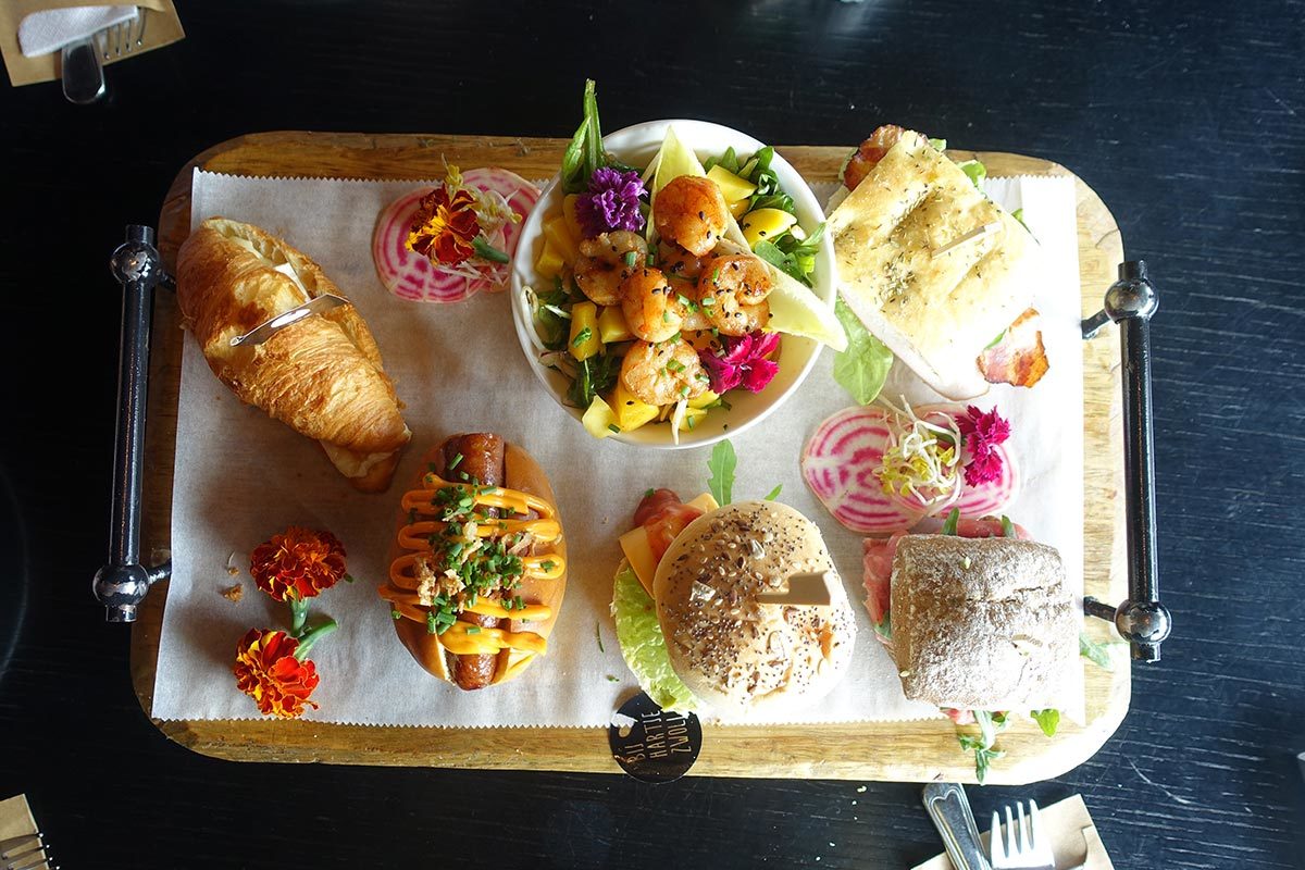 De eerste plank ziet er uit om meteen op aan te vallen en dat doen we dan ook. Je ziet een warme croissant met brie (€3), een salade met gamba’s en taugé (€3,50), een Italiaanse tosti focaccia (€3), hotdog van Brandt & Levie (€4), een huisgemaakt hamburgertje (€4) en een broodje carpaccio (€3).