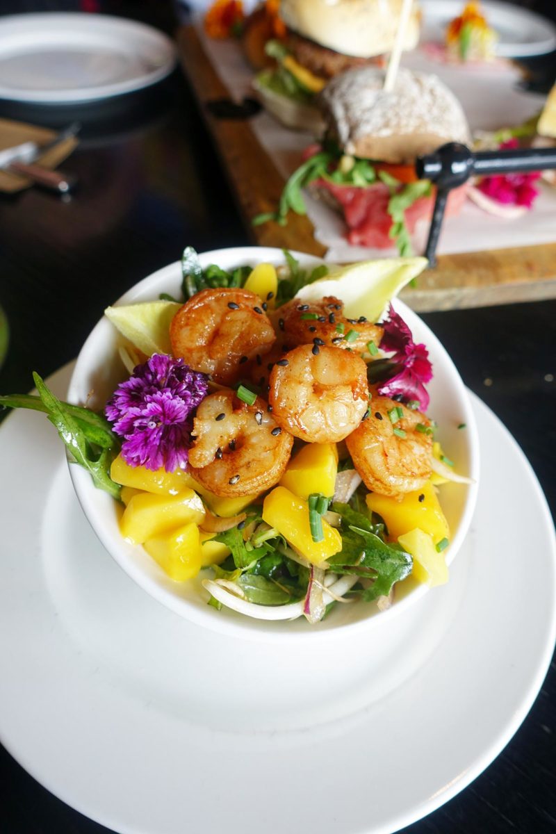 Ik neem eerst mijn salade met gamba’s en taugé. Er zit ook mango en witlof in en het smaakt fris en zoet, de gamba’s zijn warm, vol van smaak en lekker kruidig. Wat een lekkere salade!