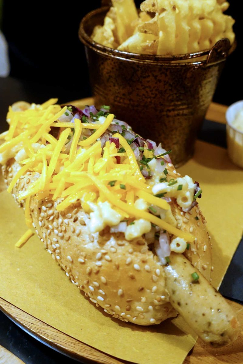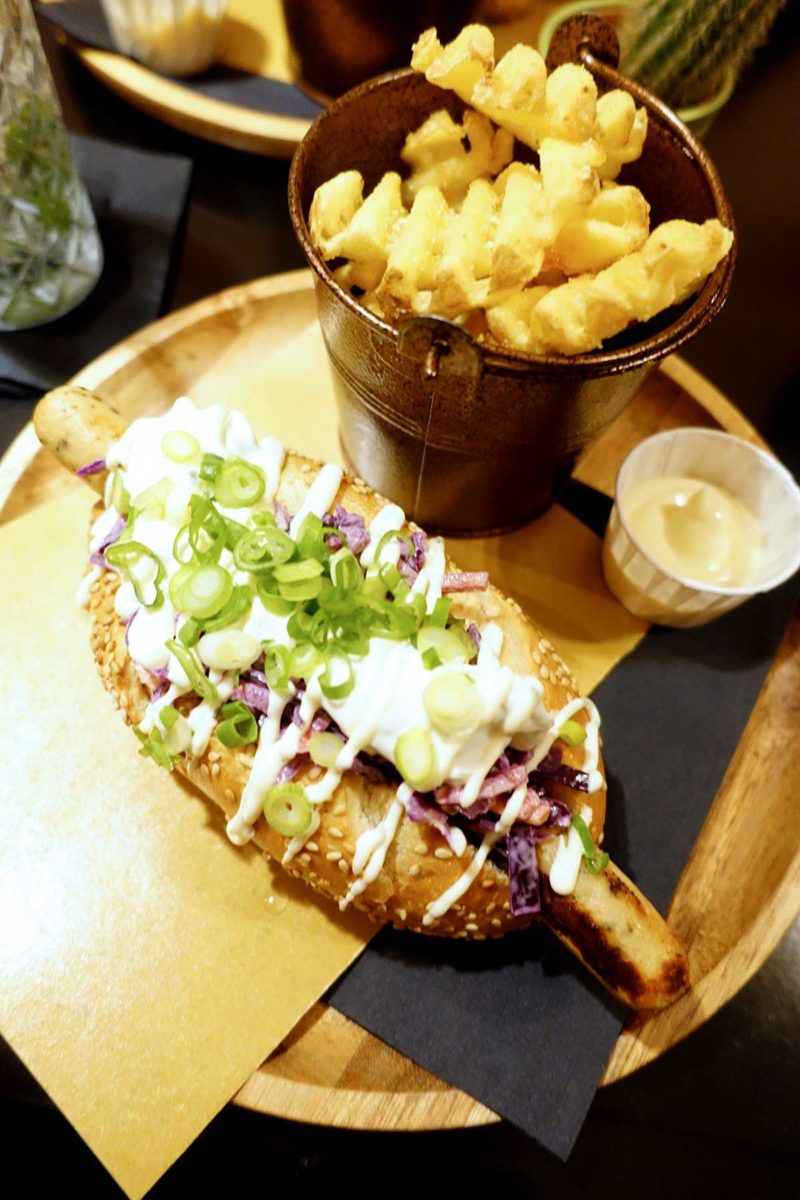 Bij Dogtails kan je kiezen uit zes verschillende hotdogs, waarbij je altijd zelf je worst kan kiezen. Er zijn vier worsten: halfom, rund, kip en vega en dan kan je ook nog voor een XXL worst of een ‘footlong’ gaan. De signature hotdog is a Dogs tail, met veel gerookt spek, gefrituurde uienringen en Jack Daniel’s saus. De lekkerste die ik heb gegeten is de Dirty Harry met coleslaw, chips, truffelmayo, spekjes en bosui. Maar natuurlijk kan je ook voor een vega variant gaan, die zie je op de tweede foto: de Funky Greek met rode coleslaw, tzatziki, huisgemaakte limoen-tijmmayo en bosui. Dat is een hele frisse hotdog met lekker veel coleslaw, dat geeft ook een fijne bite. Op de eerste foto zie je trouwens de hotdog van de maand maart, met mac & cheese. In beide hotdogs op de foto zit een vegetarische worst. Ze gebruiken de ‘worsten’ van de Vegetarische Slager en die zijn hartstikke lekker.