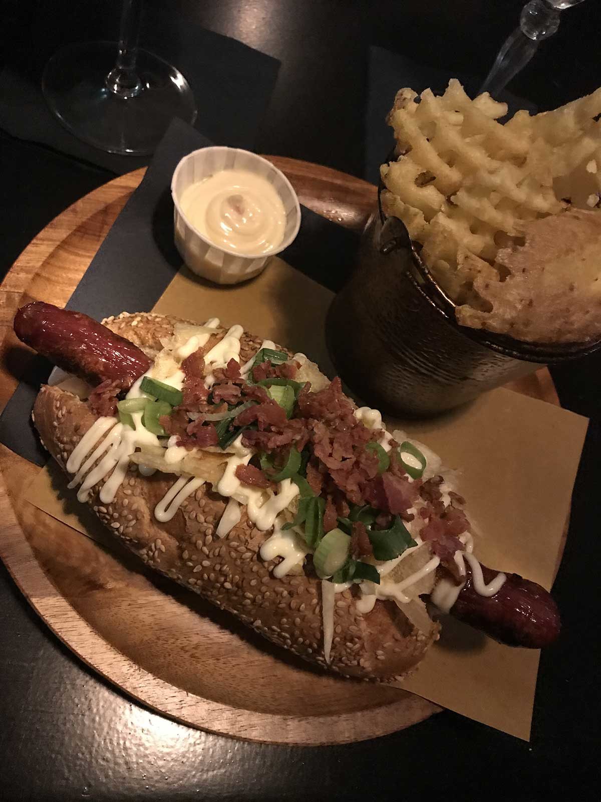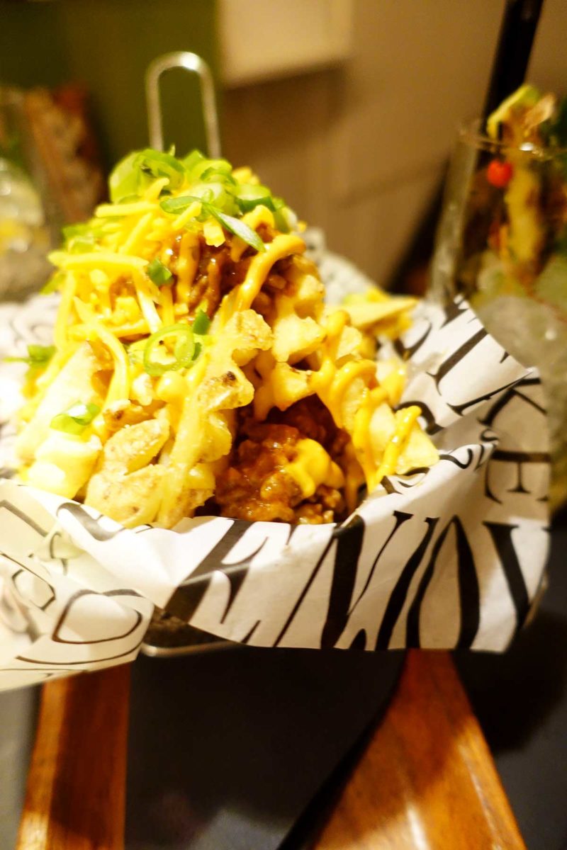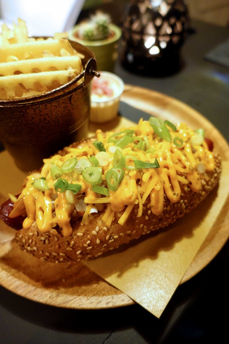 Een losse hotdog kost trouwens €8 – €8,50, een hotdog met friet €11 – €11,50 en je krijgt 10% korting op je cocktail bij je hotdog. Een losse friet kost bijvoorbeeld €3,50, bitterballen €5 en extra toppings voor op je hotdog (zoals bosuitjes, cheddar, coleslaw of knoflooksaus) kosten €1. Prima prijzen, en zo’n combinatie is trouwens ook wel een vullende maaltijd.
