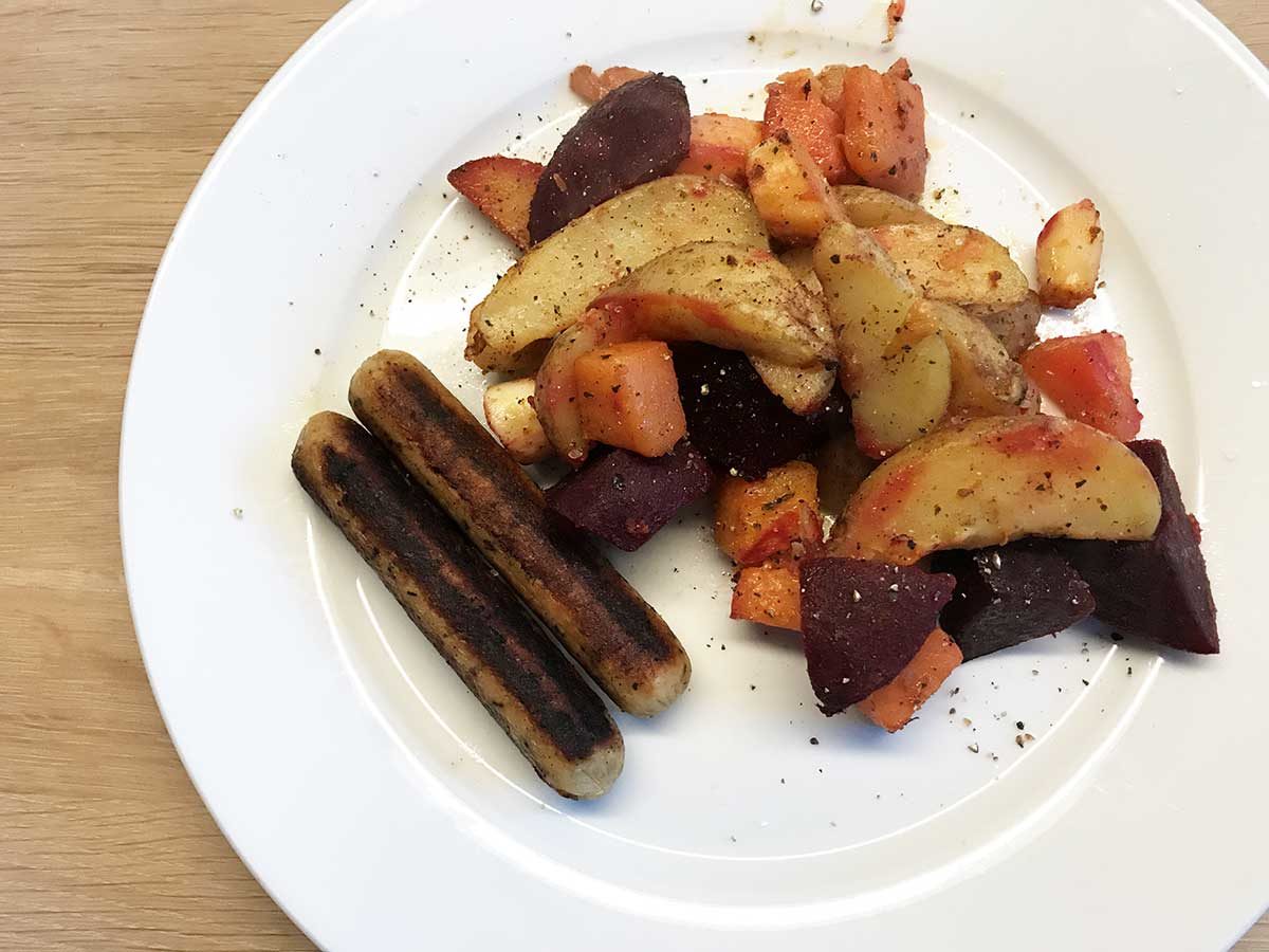 Tja, dit gerecht heeft niet echt een naam. Elke week gooien we wel een keer vanalles in de oven en dat is dan ons avondeten. Dat klinkt heel armoedig, maar het is enorm lekker. Deze keer doe ik biet, pastinaak, pompoen en aardappel in de oven. Ik snijd alles in ongeveer even grote stukken, doe er wat olijfolie, peper, zout en Baharat (Arabische kruidenmix) op, meng alles goed door elkaar en dit gaat dan ongeveer 45 minuten tot een uur in een voorverwarmde oven (op 200 – 250 graden). Je kan worstjes in de ovenschaal doen, maar ik maak nu vegetarische worstjes (van De Vegetarische Slager) en die kunnen niet in de oven, dus die bak ik even in de pan in wat olijfolie. Het maken kost nog geen tien minuten, alleen moet je even wat tijd voor de oven reserveren.