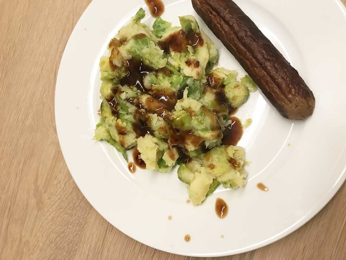 Dit is trouwens heel makkelijk te maken. Je kookt kruimige aardappels (ongeveer 20 minuten), spruitjes (ongeveer 7-8 minuten zodat ze nog lekker stevig en knapperig zijn) en dit stamp je door elkaar. Om het wat smeuïger te maken doe ik er vaak een scheut melk bij, Willem doet er het liefst een klont boter doorheen. That’s it. Jus haal ik gewoon uit een pakje, en ik bak er dan een worstje bij.