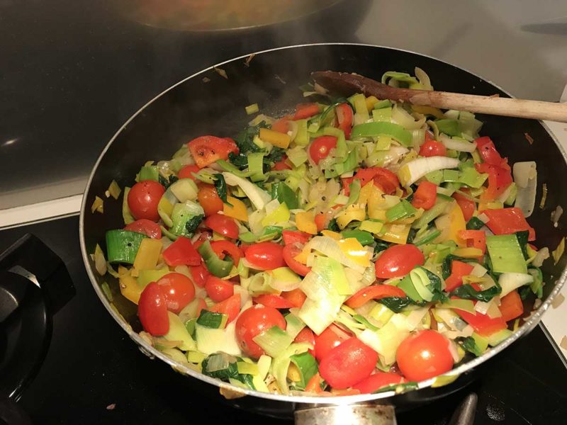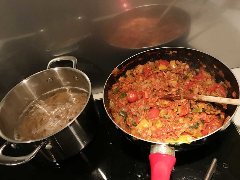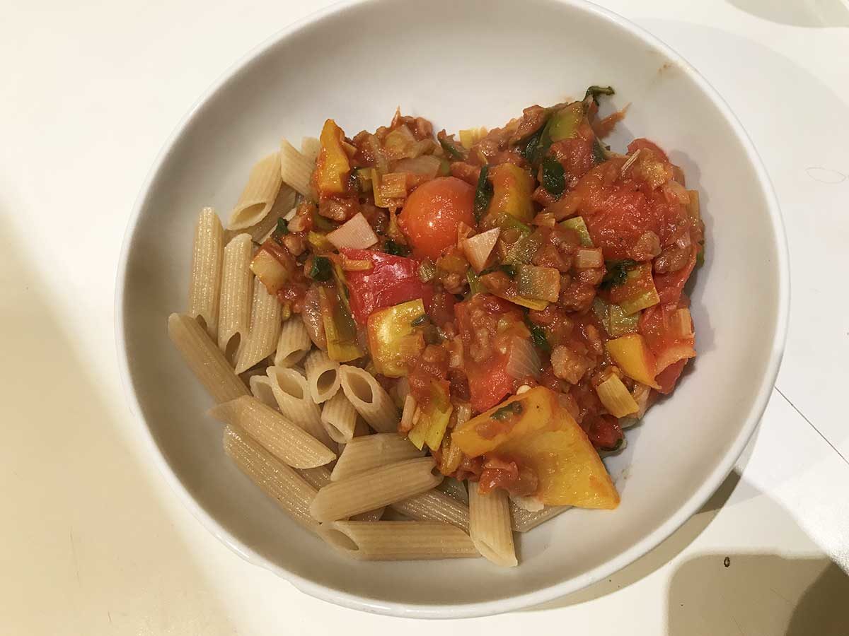 Pasta! Ik maak meestal een pasta met héél veel groente, vandaag is dat veel prei, ui en tomaatjes. Dat bak ik tot het allemaal lekker zacht is met wat knoflook, dan doe ik er een pak tomatenpassata bij, peper en zout, even lekker pruttelen. Als het bijna klaar is doe ik er vegetarisch gehakt doorheen – het kan ook zonder, maar ik vind die bite wel erg lekker. We eten dit met speltpasta, maar het kan natuurlijk met elke soort pasta die jij lekker vindt. Niet hoe de Italianen het bedacht hebben, wel hoe wij het graag eten.