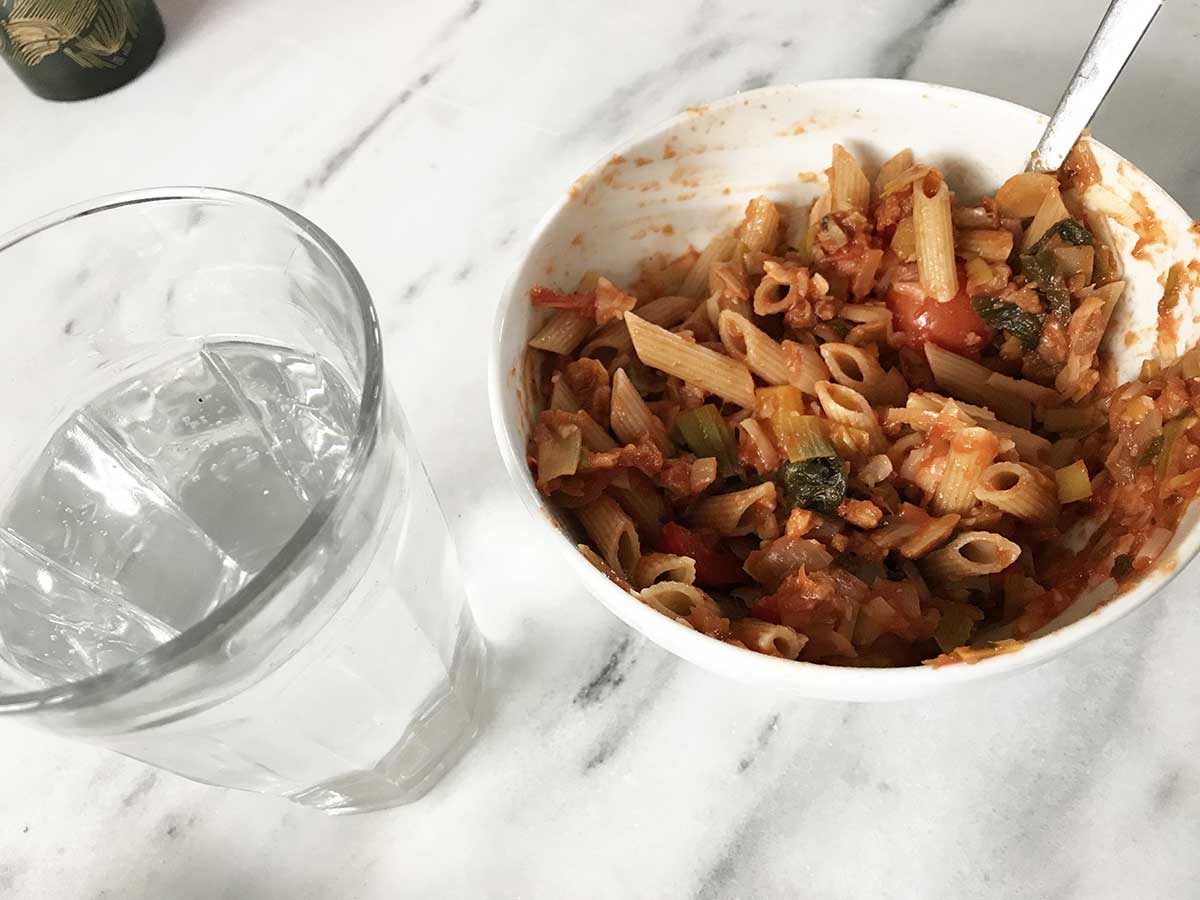 Vrijdagavond ga ik vroeg sporten en we hebben nog twee porties pasta van gisteren over, dus ik kook wat ‘nieuwe’ speltpenne, verwarm de saus en zo kan ik nog een keer heerlijk eten. Ik vind pasta er nooit op vooruitgaan als je dat opnieuw verwarmt, dus daarom kook ik gewoon wat nieuwe pasta. De saus kan je prima opwarmen, dat blijft lekker.