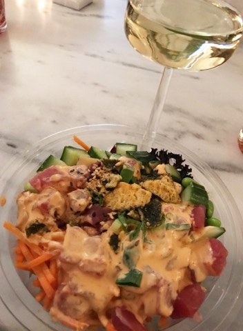 Zaterdagavond laten we eten bezorgen en we gaan voor een pokebowl! Dit bestellen we altijd bij Poke Bowl King en het is altijd zo lekker en vers. Je kan hier een uitgebreid artikel van mij erover lezen. We gaan altijd allebei voor de Sriracha Spicy Tuna. Deze keer ga ik voor de salade-variant (dus alleen met een slamelange en zonder rijst), met tonijn, edamame, wortel, krokante tempura zeewier, komkommer en pikante sriracha mayonaise. Dit is voor ons echt ‘de nieuwe sushi’, eerder bestelden we elke week wel een keertje sushi, nu wordt het meestal een pokebowl.