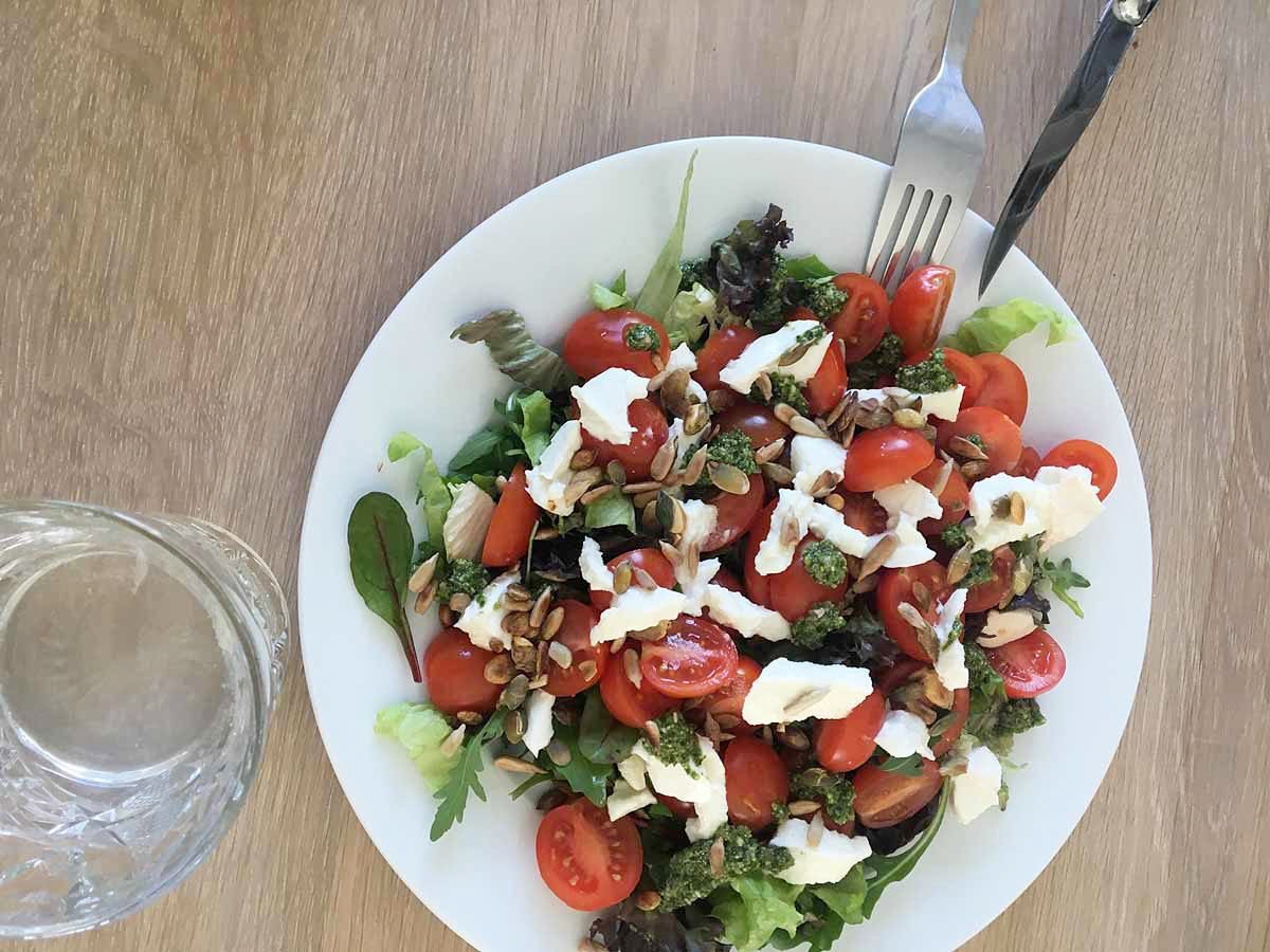 Deze ‘soort van caprese’ salade eet ik het liefst en het vaakst. Tomaten, een halve bol mozzarella, geroosterde pijnboompitjes, een beetje pesto en rucola: topcombinatie.