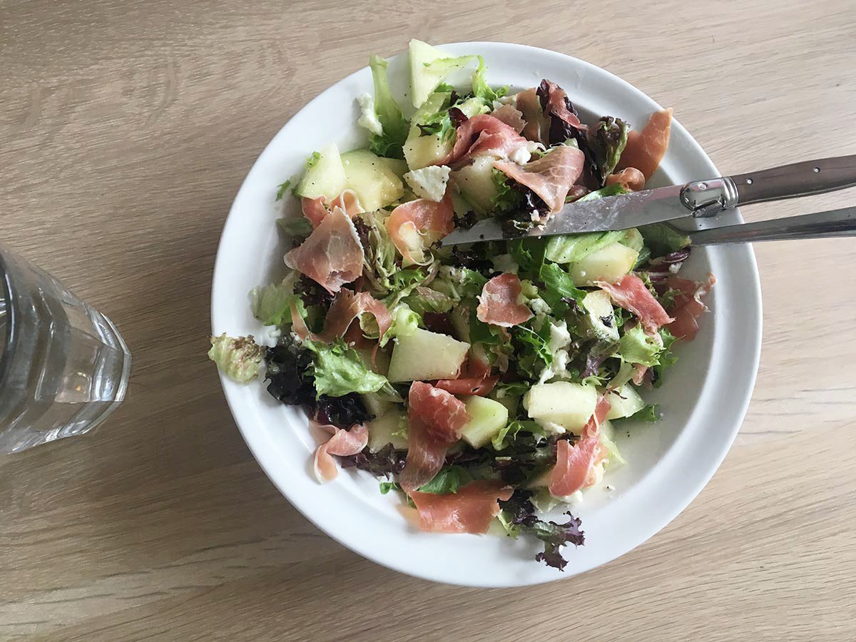 Echt een zomersalade, maar in het najaar eet ik hem ook nog weleens: deze met meloen en ham. Je neemt een halve galiameloen, een halve bol mozzarella, twee of drie plakjes parmaham, sla en een dressing van citroensap, olijfolie en peper en zout.
