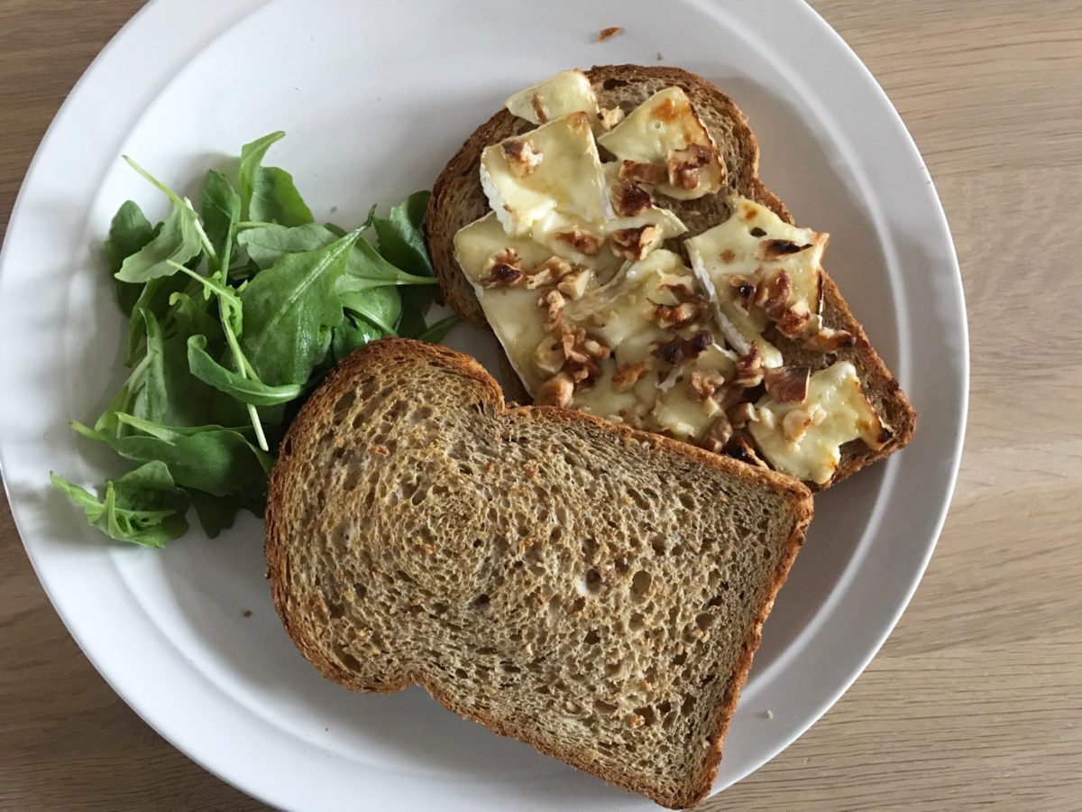 Je neemt twee sneetjes brood, een beleg je met brie, gehakte walnoten en wat honing, en dit doe je vijf tot tien minuutjes in een warme oven (ongeveer 200 graden). Nog wat rucola erbij – echt heerlijk! Ook lekker op een pistoletje of ander broodje, natuurlijk.