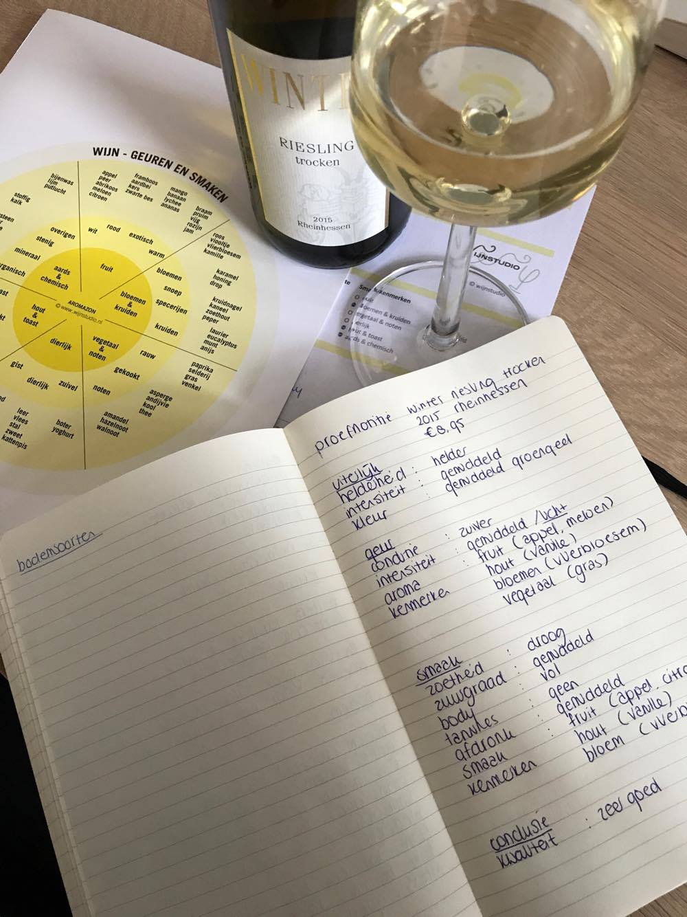 We hebben een dik lesboek meegekregen en dat betekent: huiswerk! Er staan testvragen in het boek en het is een goed idee om het laatste hoofdstuk goed door te lezen voor de volgende les. Ook staan er wat suggesties in voor wijnen om te proeven. Zo heb ik afgelopen week bij Mondovino een Riesling uit Rheinhessen gehaald en daar een proefnotitie bij gemaakt. Maar ik wil ook nog graag wat andere wijnen proberen – het uitspugen doe ik thuis wel wat minder, hoor 😉