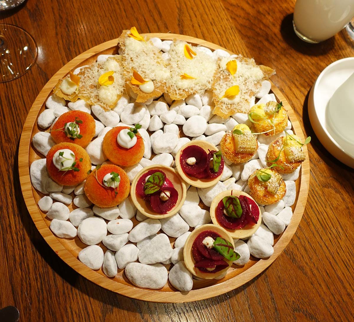 Met de klok mee, ik begin bovenaan: Komijn, comté kaas en whisky. Mais met polenta. Biet met zure room en zoethout. Pizza met tomaat en geitenyoghurt. Mijn favoriet was biet met zoethout: lekker aards en zoetig.