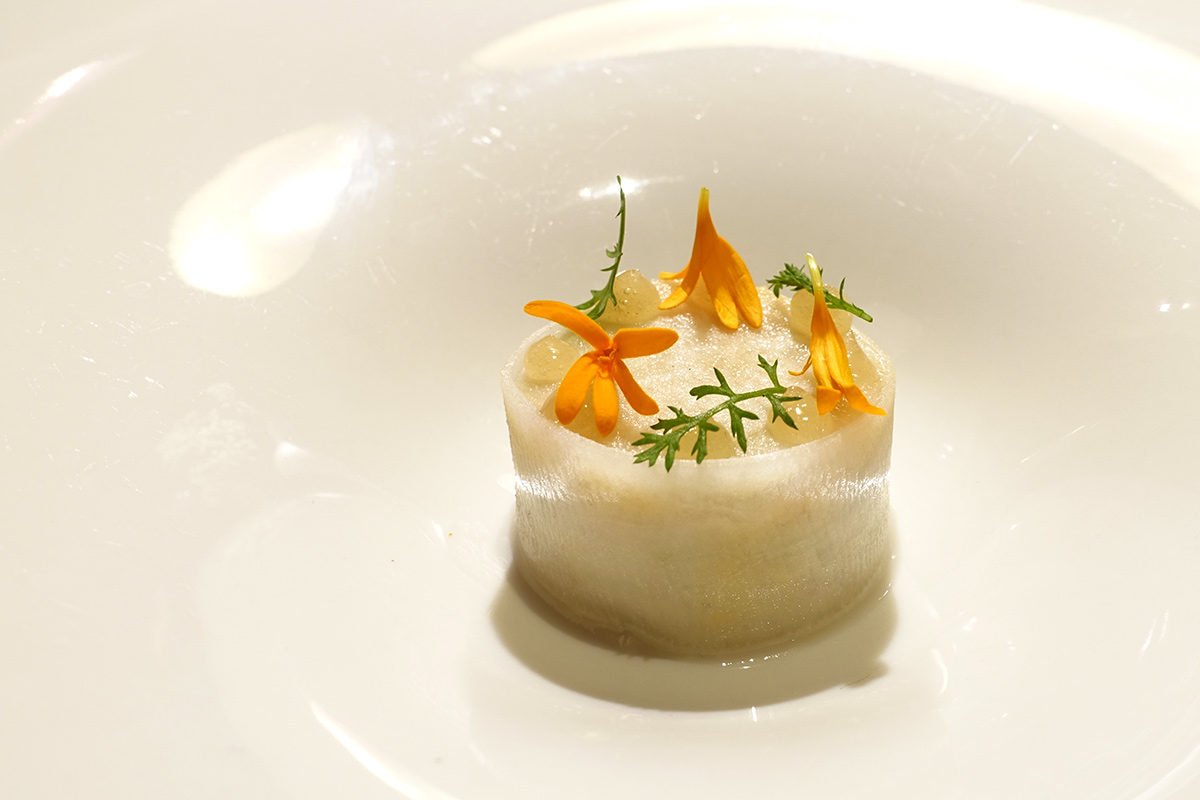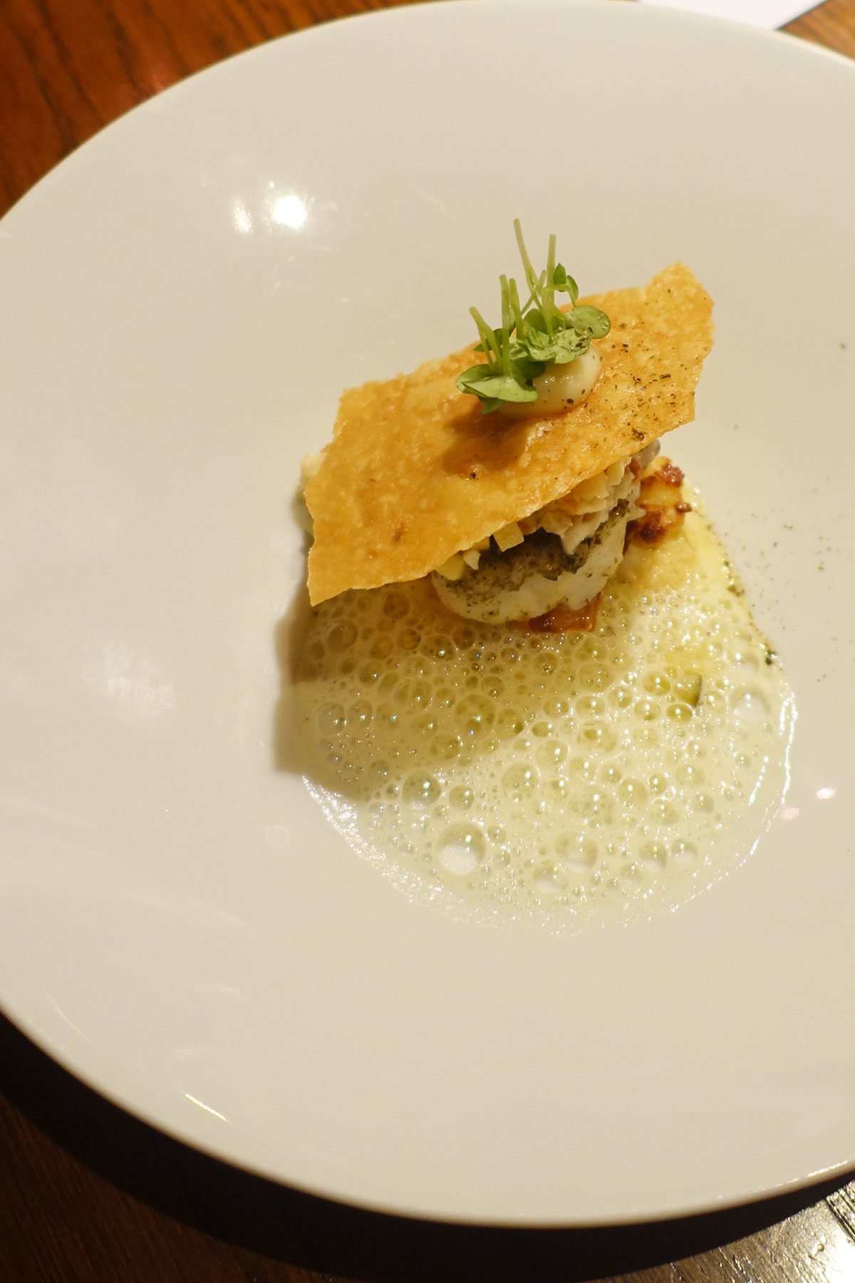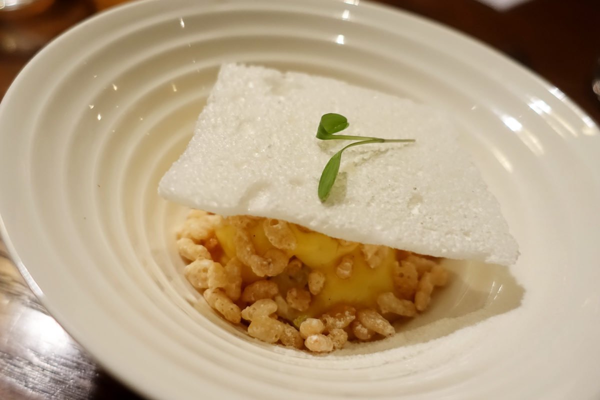 Bij gang drie begon het echte werk. Het eerste echte gerechtje is krab met winterradijs, sambai (azijn van gefermenteerde ossenstaart) en citrus. Het is mega fris, licht zoet en echt een pláátje.