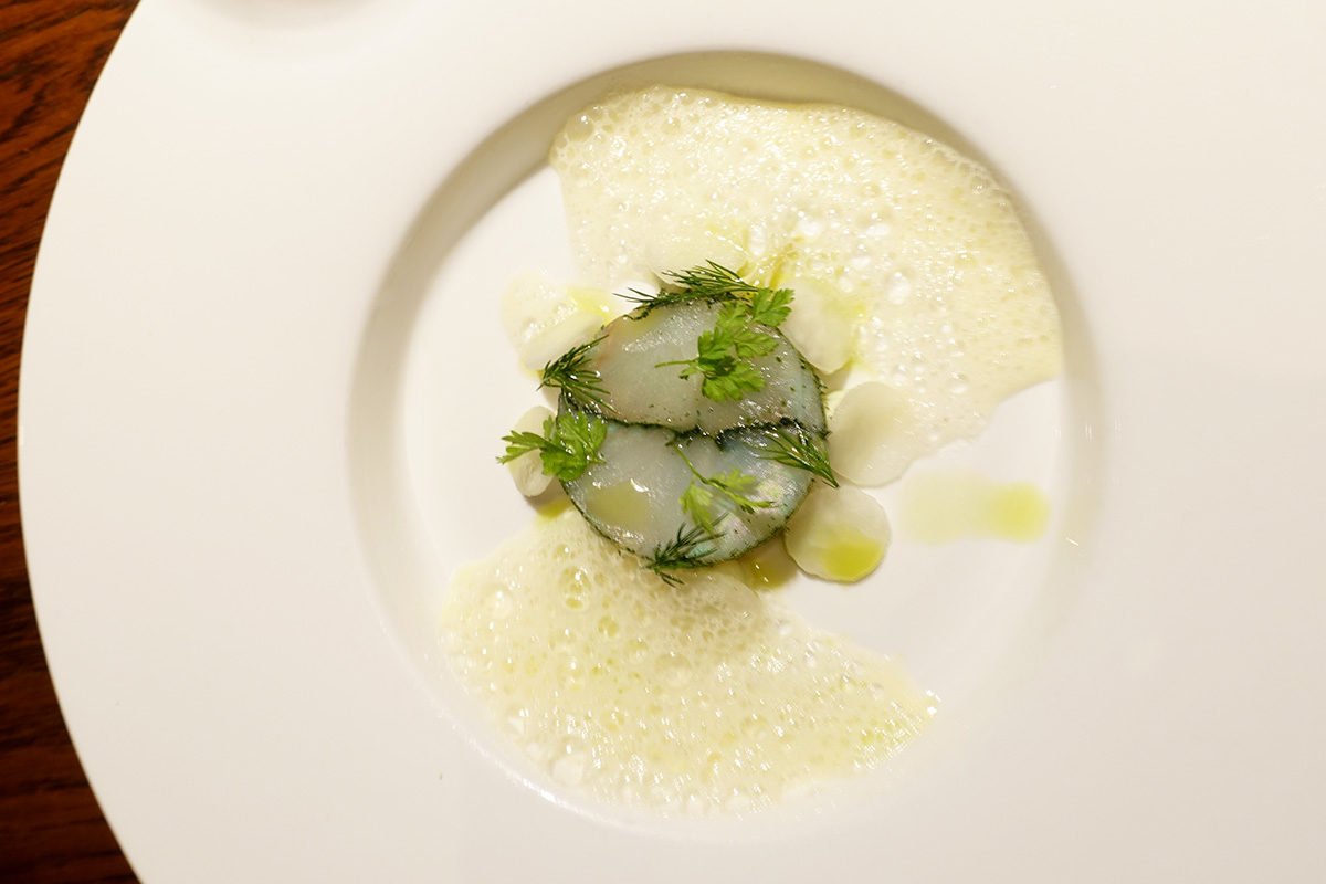 Gang vier is schelvis met kropsla en groene kruiden. De vis is boterzacht en smelt op de tong. Het is een heel fris en licht gerechtje, maar ik vind de dille wel iets overheersend.