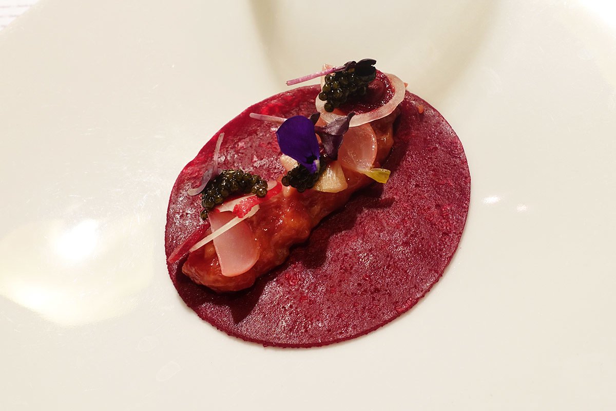De vijfde gang is een pannenkoekje van biet met rundertartaar, radijs en kaviaar. Fantastisch, de combinatie van de tartaar met kaviaar, het ziltige geeft het een extra laag. We krijgen er een riesling bij die de smaken helemaal omhoog trekt.