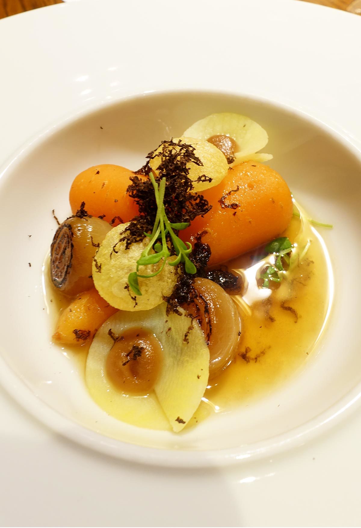 De zesde gang is hutspot! ‘Maar dan wat minder gehutst’, grapt de ober. Niet een heel spannend gerecht, maar wel erg lekker en door de truffel en krachtige bouillon goed op smaak.