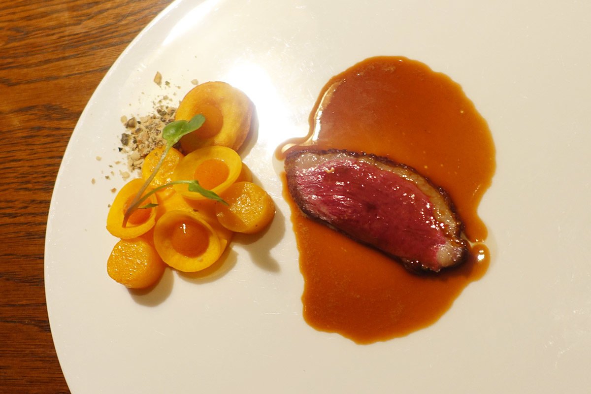 Gang negen is eend met pompoen en duindoornbes. Een van mijn favorieten: de eend is enorm mals en de zoete pompoenbereidingen smaken er mega goed bij.