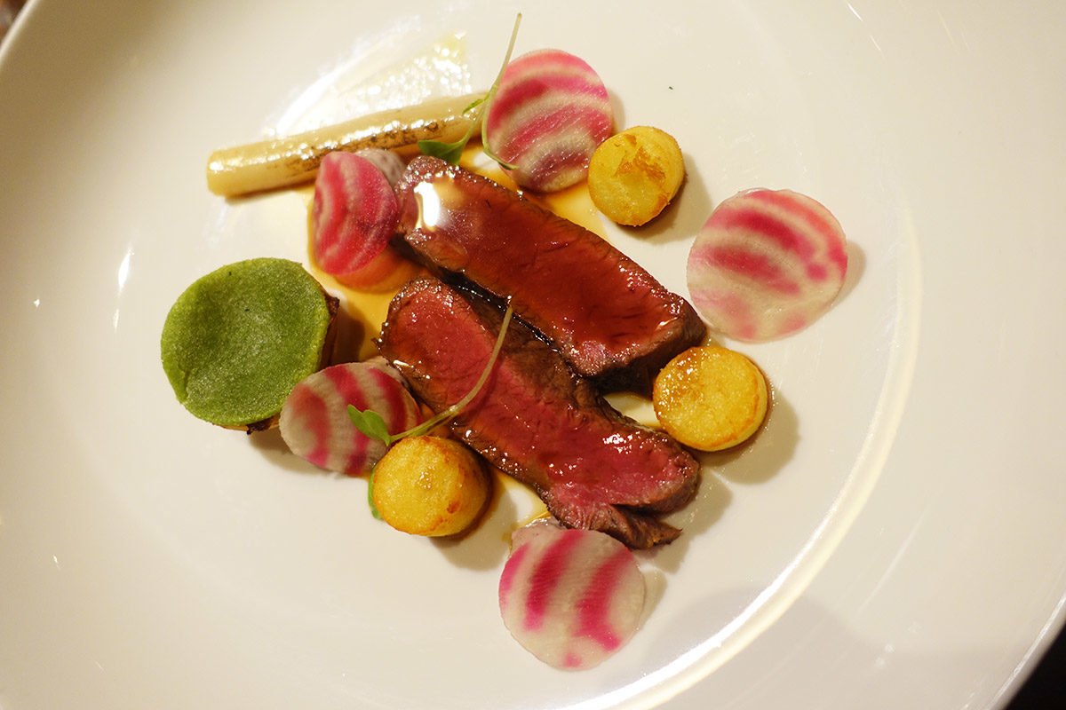 Zonder om extra’s te vragen krijgen we een extra vleesgerecht. Wauw! On the spot maken ze nog een extra gang om iets met de feedback te doen. Heel verrassend. Je ziet rundersukade met biet, uientartelette en mosterd. Waanzinnig lekker. De sukade is zo zacht, niet normaal. Alles eromheen geeft het meer diepgang. Wauw!