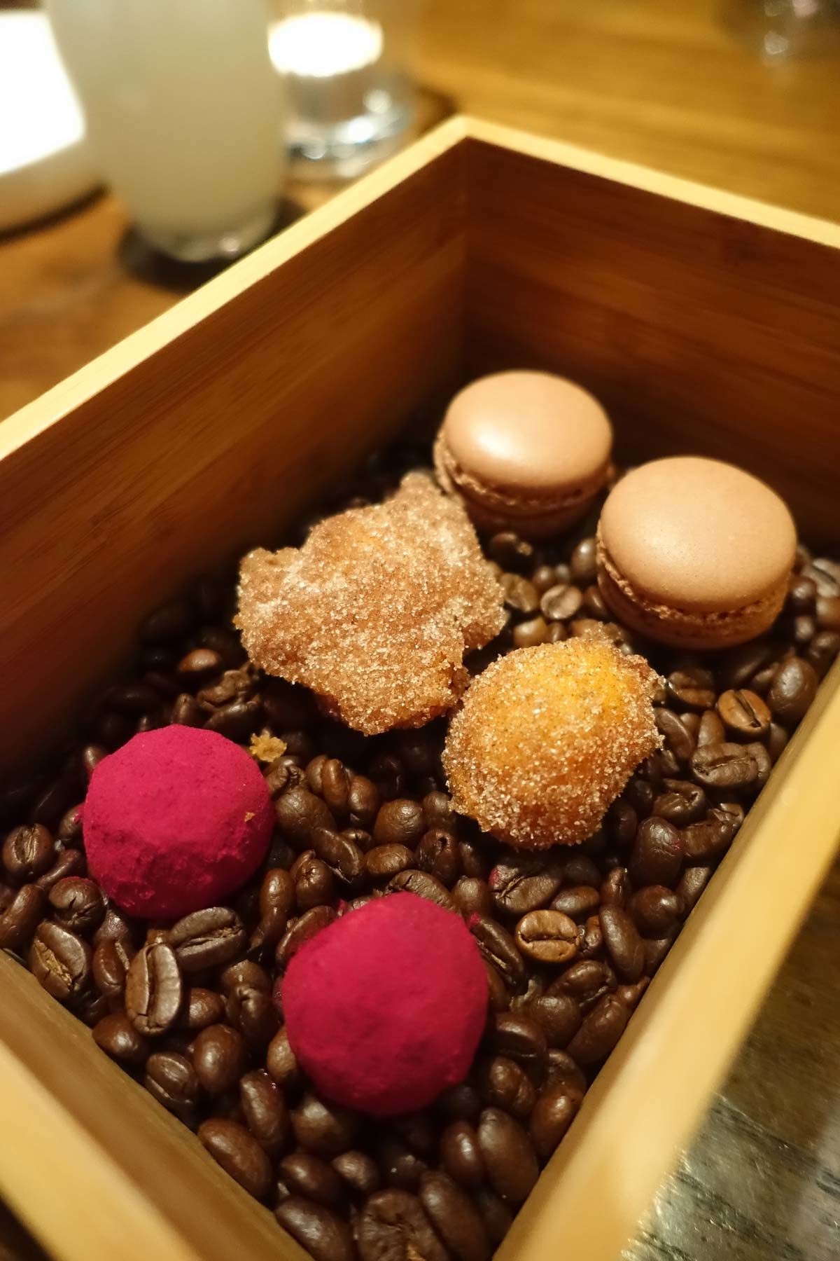 De friandises bij de koffie zijn een knallende afsluiter. Je ziet links witte chocoladetruffels met biet. Daarnaast beignets van pompoen en macarons van pastinaak. Vooral die pastinaakmacarons zijn intens van smaak!