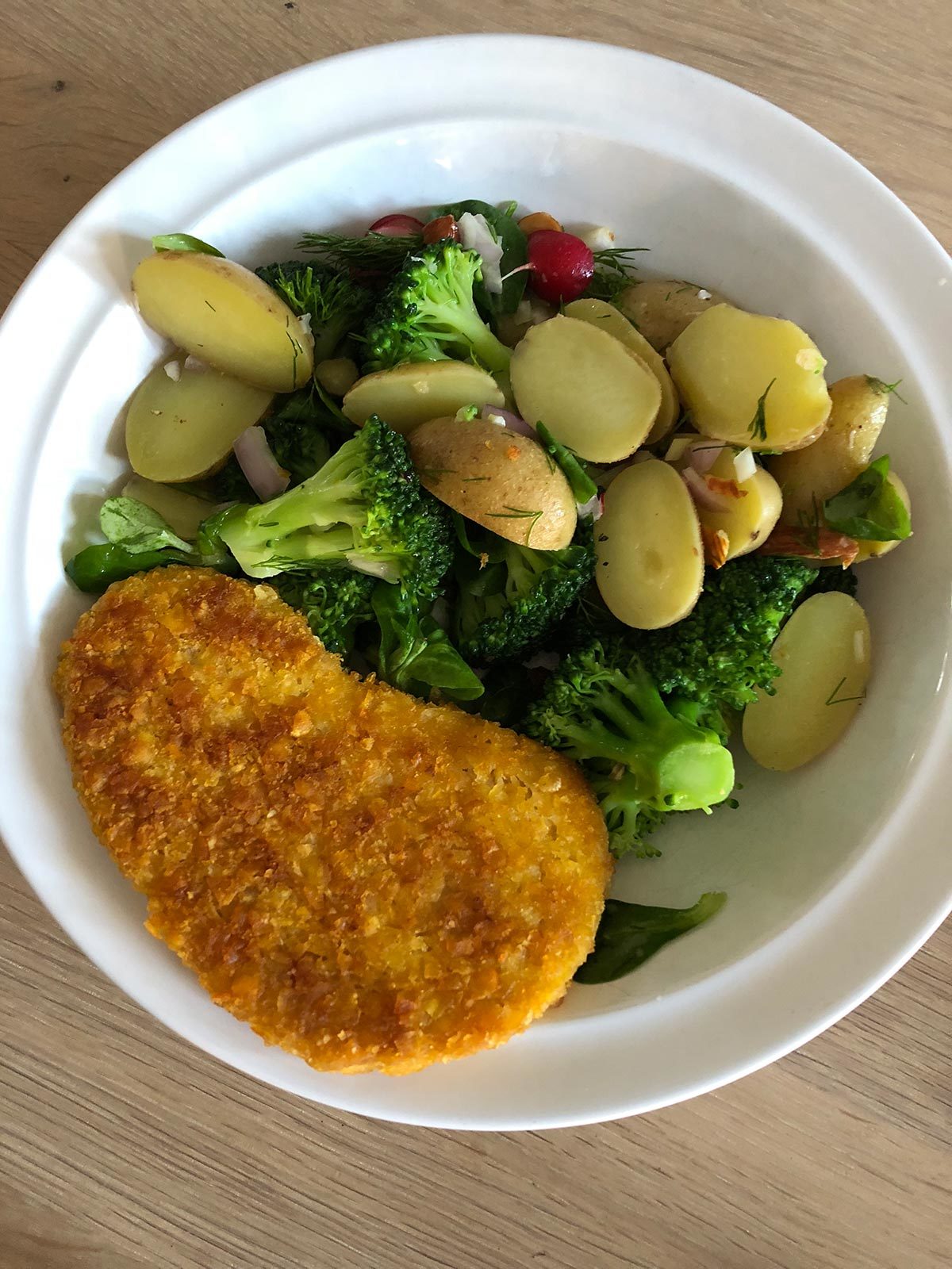 Even als bonus er nog bij, wat we op zondag van week 13 aten. Ik maak dit gerecht van Allerhande, het is een salade met aardappel, broccoli, augurkjes, amandelen en radijsjes met een vegaschnitzel. Dit is lekkerder dan ik had verwacht! De salade is heel fris door de dressing en de verse dille. Ik zou zelf bij een salade niet zo snel zo’n vegaschnitzel doen maar eigenlijk was het hartstikke lekker. Zeker voor herhaling vatbaar. Maar misschien zou ik dan zelf een vleesvervanger juist door de salade heen doen.