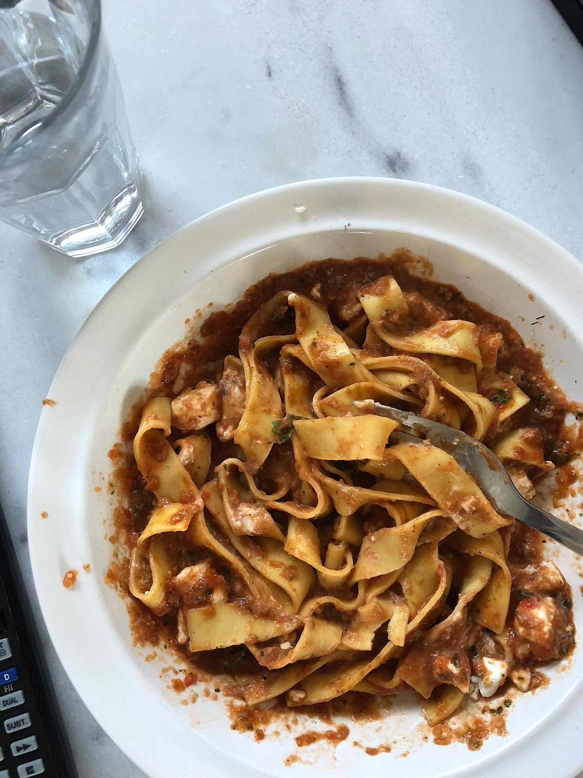 Dit was lékker! Verse pasta met een heel eenvoudige groentesaus (gepureerd) met geitenkaas erbij. Dit is het recept.