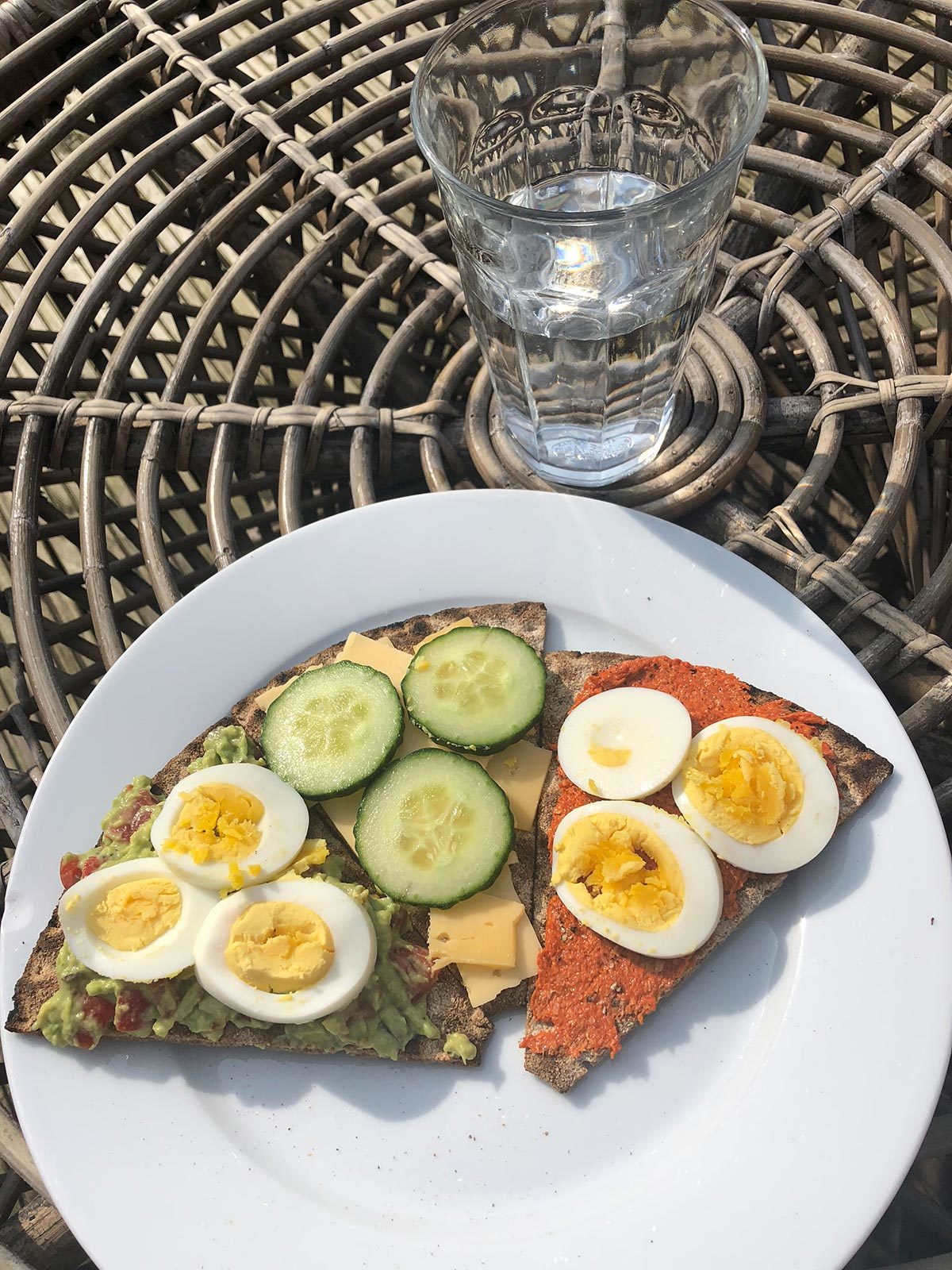 Je hebt dan genoeg voor drie boterhammen of zo, het is best veel. Ik doe er dus wat van op die cracker met een half gekookt ei. Op de andere cracker gaat kaas met komkommer. En op de andere vegetarische Filet Americain (van de Vegetarische Slager) met peper en zout en de andere helft van ei.