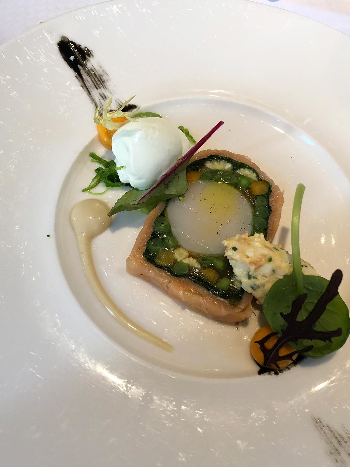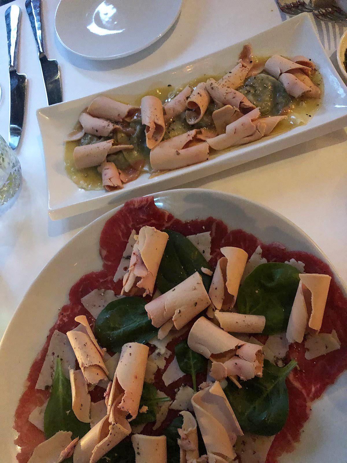We delen deze voorgerechten: carpaccio en ravioli met eend en lever.