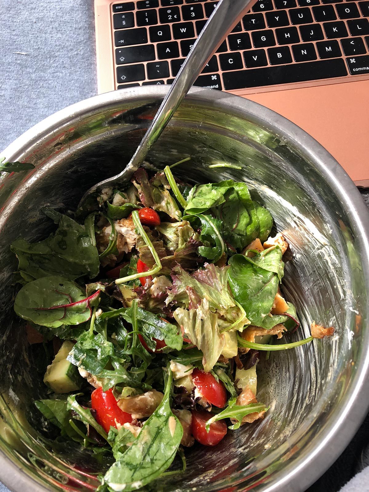 Deze salade eet ik deze week twee keer als lunch. Je ziet een slamelange, tomaatjes, komkommer, kipstuckjes van de Vegetarische Slager, wat jonge geitenkaas en een dressing van goede olijfolie en balsamico met peper en zout. Eerder deze week at ik hem met feta in plaats van geitenkaas, er was wat over van vorige week.