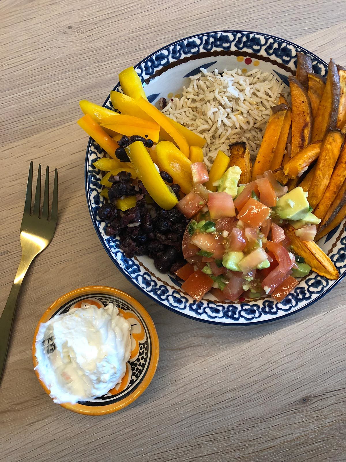 Donderdag maak ik deze ’tacobowl’ met zoete aardappel, gebakken bonen, een salsa van tomaat en avocado, paprika en een dip van yoghurt met feta. Ik vond het wel lekker en vooral fris smaken, maar ook een beetje saai. Ik miste iets wat het een gerecht maakte, wat de ingrediënten verbond of zo.