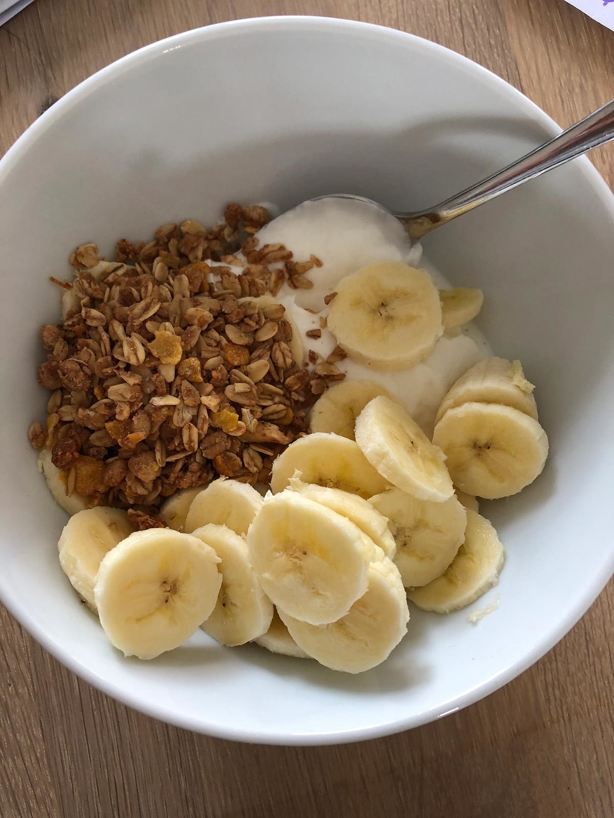 Ik lunch vandaag met magere yoghurt met Bolletje Krokante Muesli en een banaan.