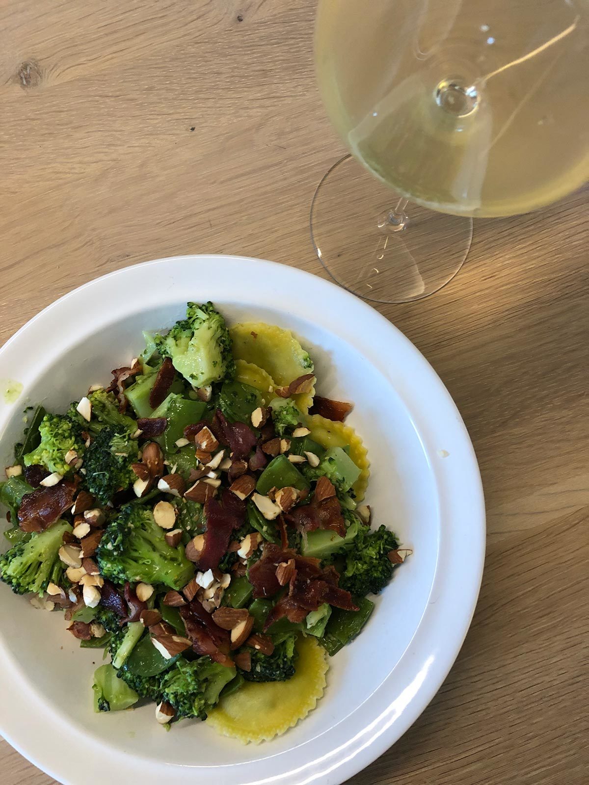 Ravioli met snijbonen, broccoli, pesto, amandelen en uitgebakken spek