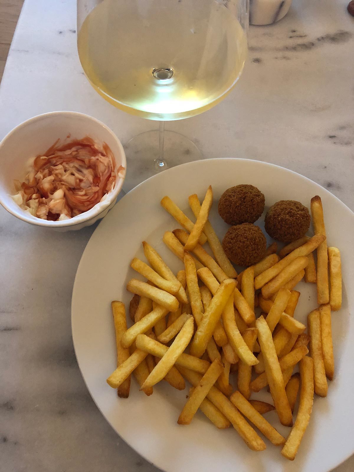 Zaterdag kom ik rond achten thuis en na een wandeling met Kees heb ik toch ineens best wel honger. Ik slinger de Airfryer aan en doe er wat frietjes en bitterballen in. Glaasje Chardonnay erbij, Temptation Island, mij hoor je niet. Patat kan ik echt altijd, elke dag eten.