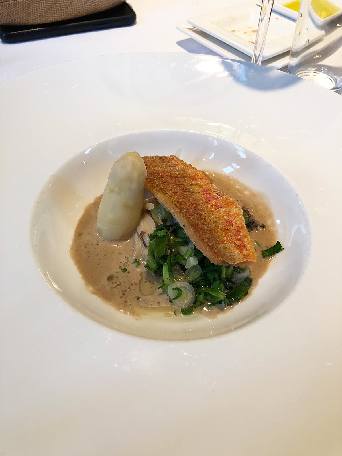 Roodbaars met aspergespaghetti en saus van morilles. Die combinatie van paddenstoel en vis is zoooo lekker.
